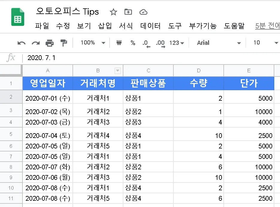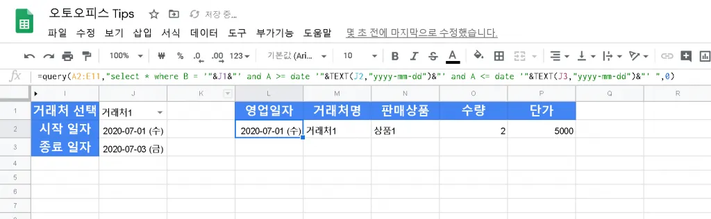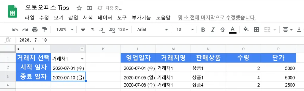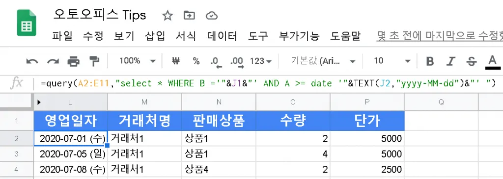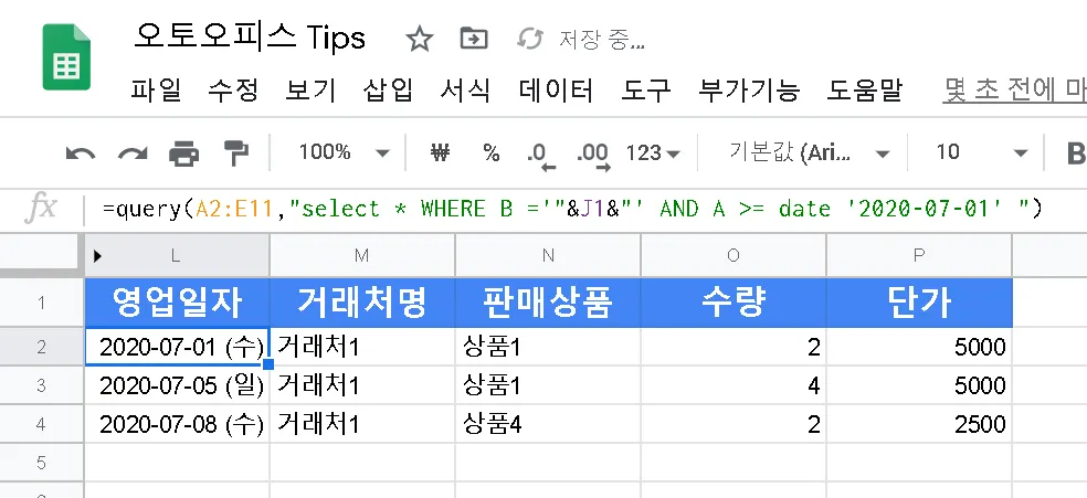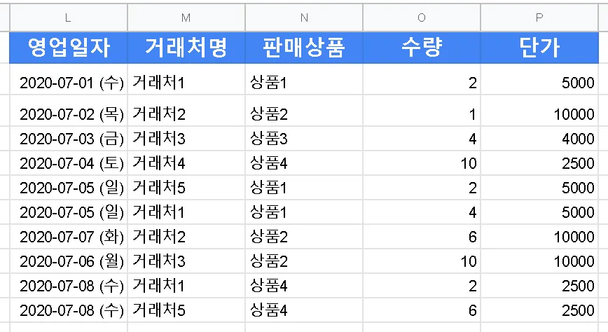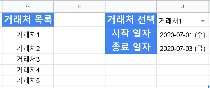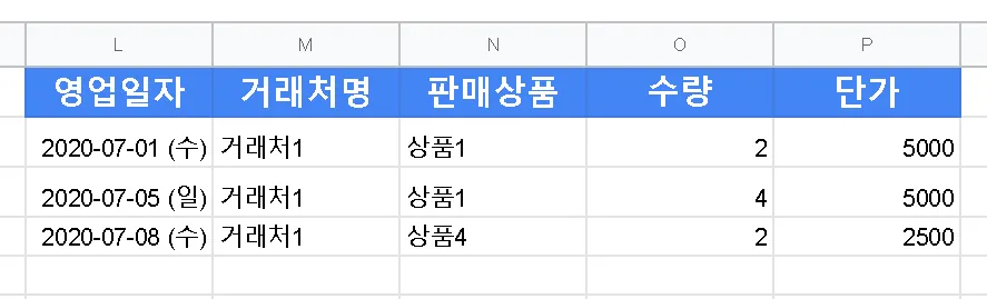 거래처1의 7/1 ~ 7/3 까지의 값을 가져왔습니다. 성공입니다.