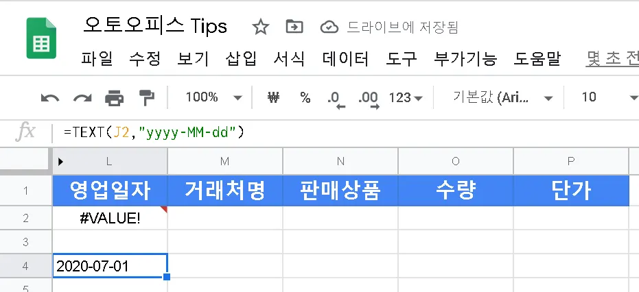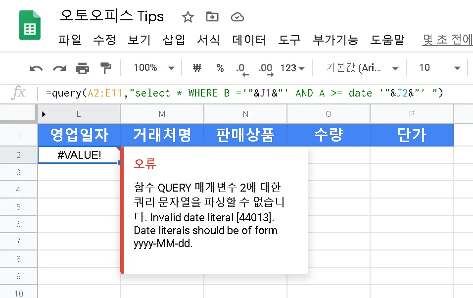 원인은 J2의 날짜를 쿼리로 참조하면 yyyy-MM-dd 의 형식으로 표현되지 않기 때문입니다. 이 형식에 맞춰서 표현하려면 TEXT 함수를 사용해야 합니다. 아래쪽에 테스트를 해보겠습니다.
