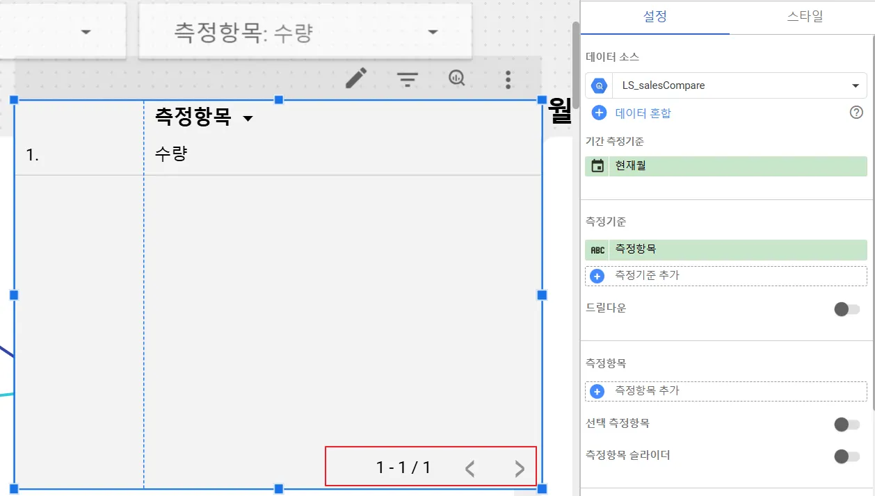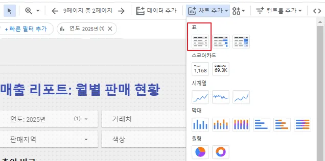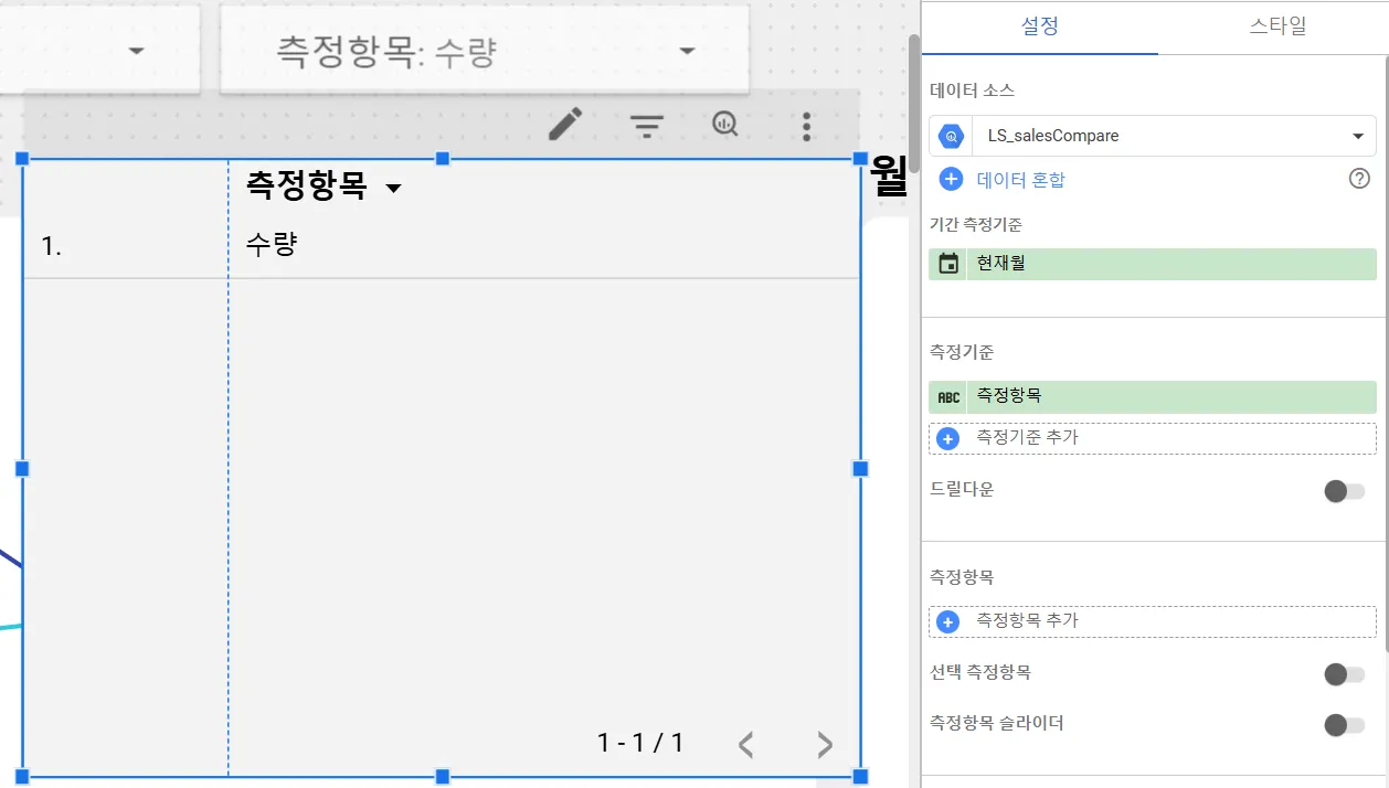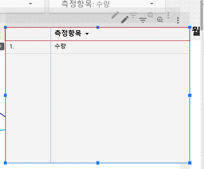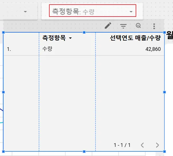 선택한 연도나 측정항목 등 선택한 값을 화면에 동적으로 보여주는 기본적인 원리는 표 차트를 활용하는 것입니다. 먼저 표 차트를 추가해보겠습니다.