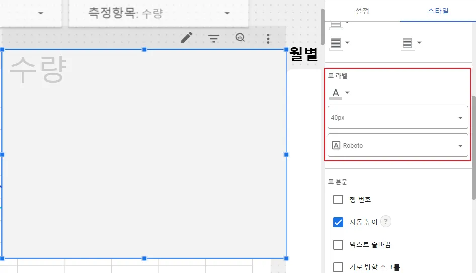 다음으로 스타일 탭에서 ‘표 라벨’ 옵션을 설정하겠습니다. ‘표 라벨’ 옵션에서는 차트에 나오는 폰트와 폰트의 색상, 크기를 설정할 수 있습니다. 차트에 표시되는 라벨이기 때문에 색상이 도드라지지 않도록 옅은 회색으로, 폰트 사이즈는 40px로 설정하겠습니다.
