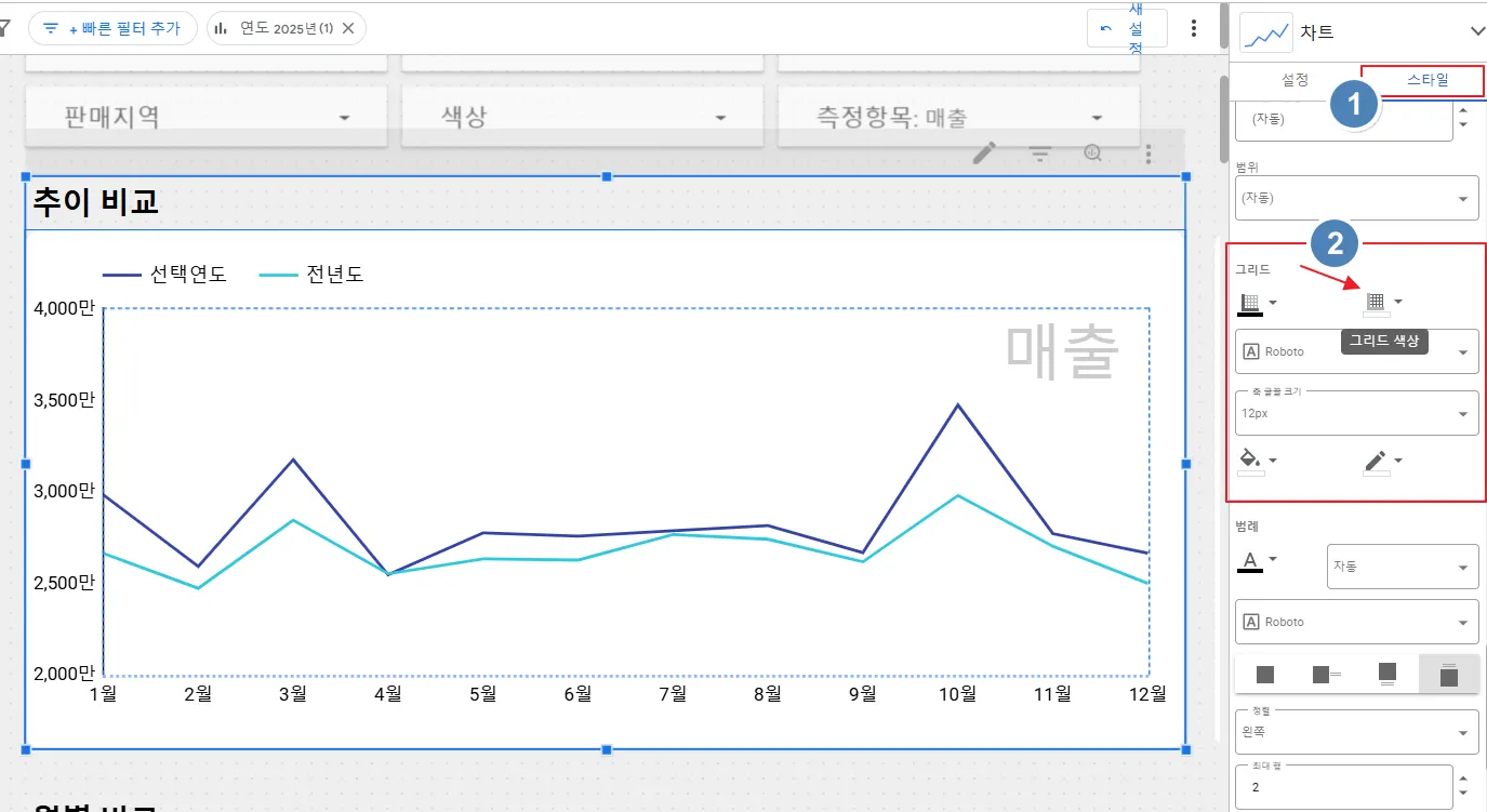 시계열 차트의 그리드와 표 차트의 라벨이 겹쳐서 보이므로 시계열 차트의 그리드는 보이지 않도록 설정하겠습니다. 방법은 시계열 차트 ‘스타일’ 탭 → ‘그리드’ → ‘그리드 색상’을 클릭하면 컬러팔레트가 나옵니다. 여기서 색상을 설정할 수 있습니다. 예시에서는 차트의 배경이 흰색이므로 그리드의 색상도 흰색으로 처리하겠습니다.