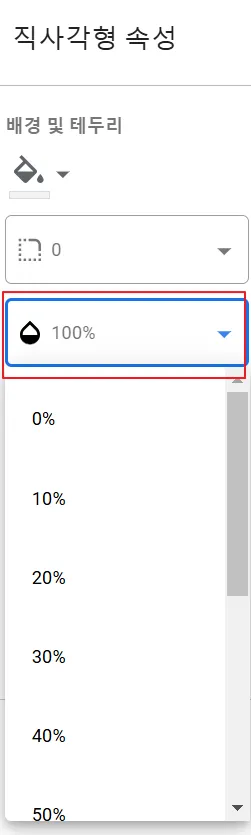 그리고 배경 색상을 ‘투명’으로 설정합니다. 그 외 다른 방법도 있는데, 도형의 속성을 보면 아래 이미지의 빨간 박스 옵션이 있습니다. 이것은 도형의 투명도를 조정하는 기능을 합니다. 이 투명도를 0으로 설정하면, 헤더 위에 도형이 투명하게 만드는 효과가 있습니다.
