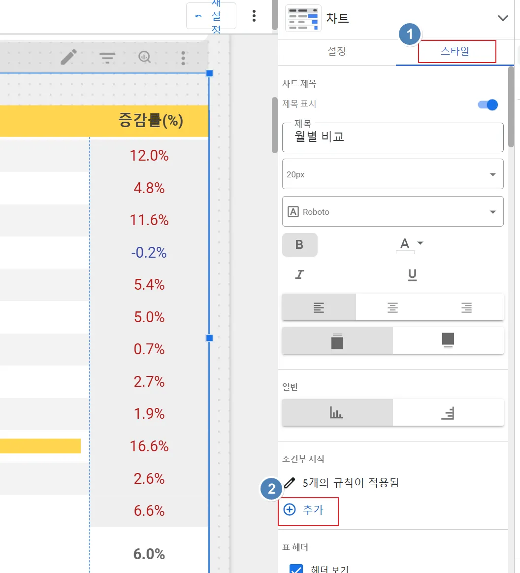 이것은 표의 ‘스타일’ 탭에서 지정합니다. 표 차트 클릭 후 ‘스타일’ → ‘조건부 서식’ 의 ‘추가’ 버튼을 클릭합니다.