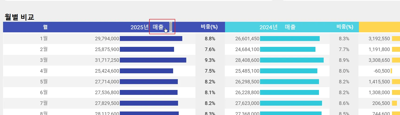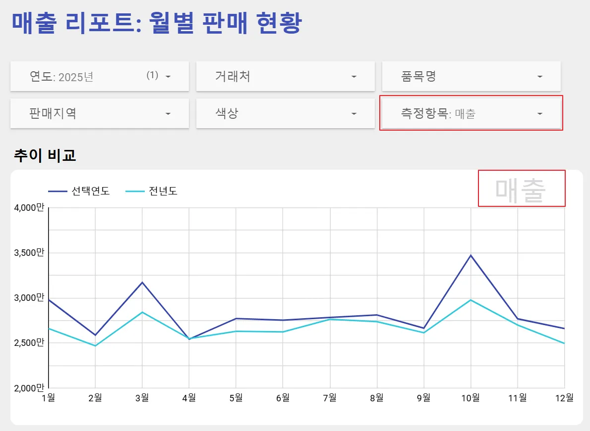 측정항목 필터를 ‘매출’로 변경하면 다음과 같이 라벨이 변경되는 것을 확인할 수 있습니다.