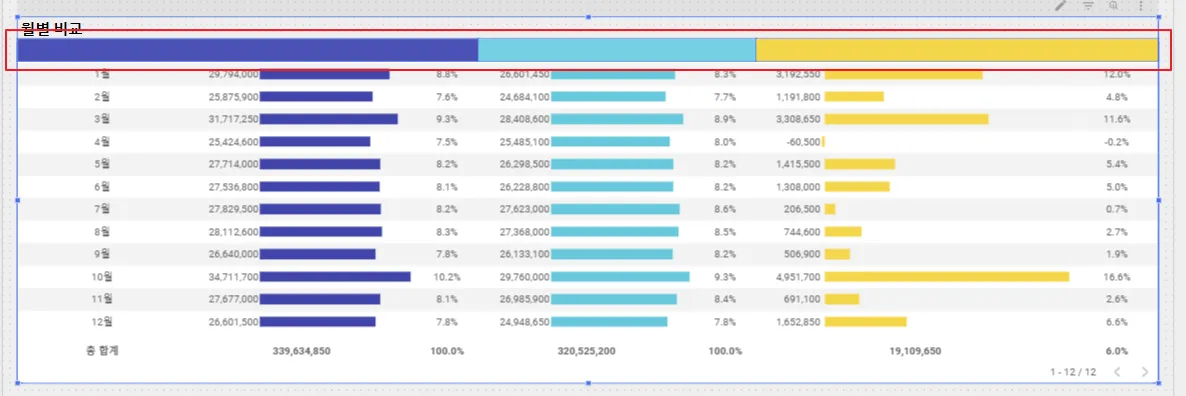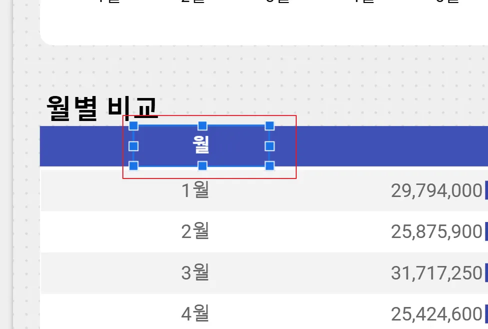 커스텀 헤더가 완성되었습니다. 그런데 표 차트는 교차필터링을 지원하기 때문에 표 위에 커서를 올리면 다음 이미지와 같이 커서가 변경되며 스크롤이 화면에 나타납니다. 깔끔한 미관을 위해 후처리해보겠습니다.
