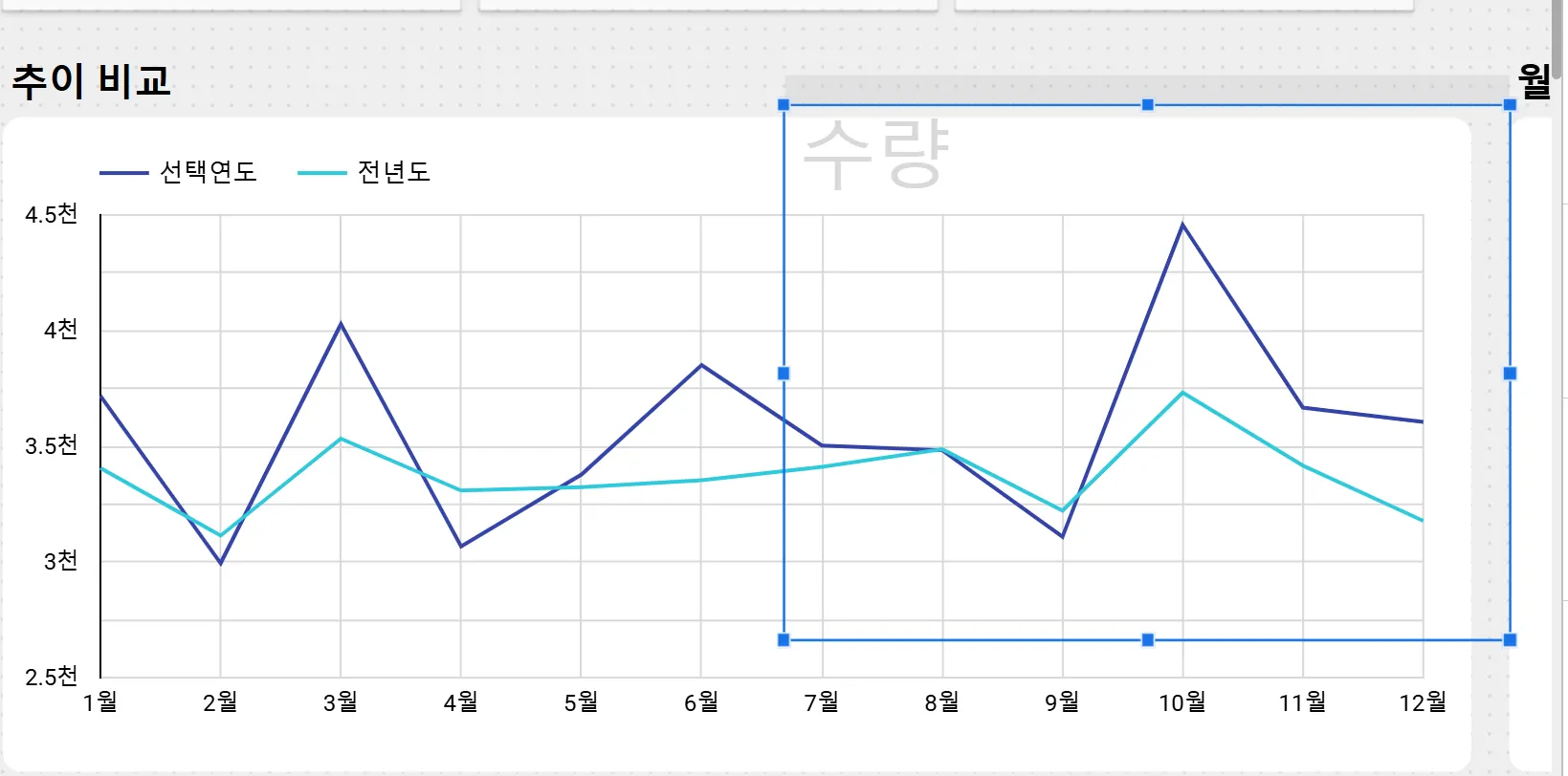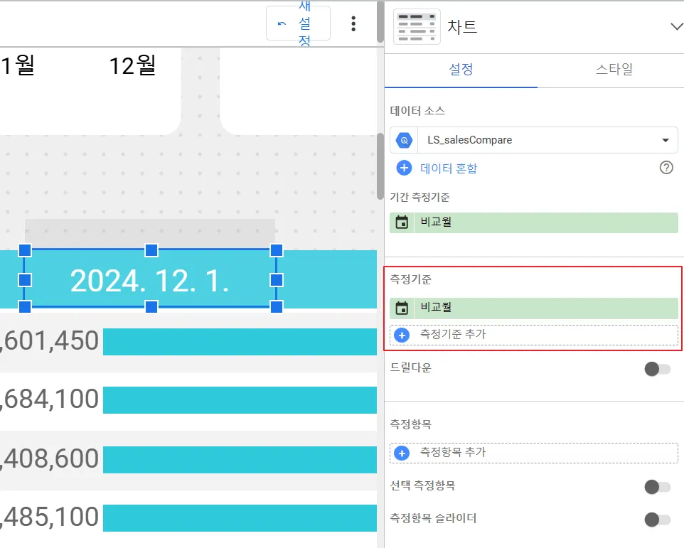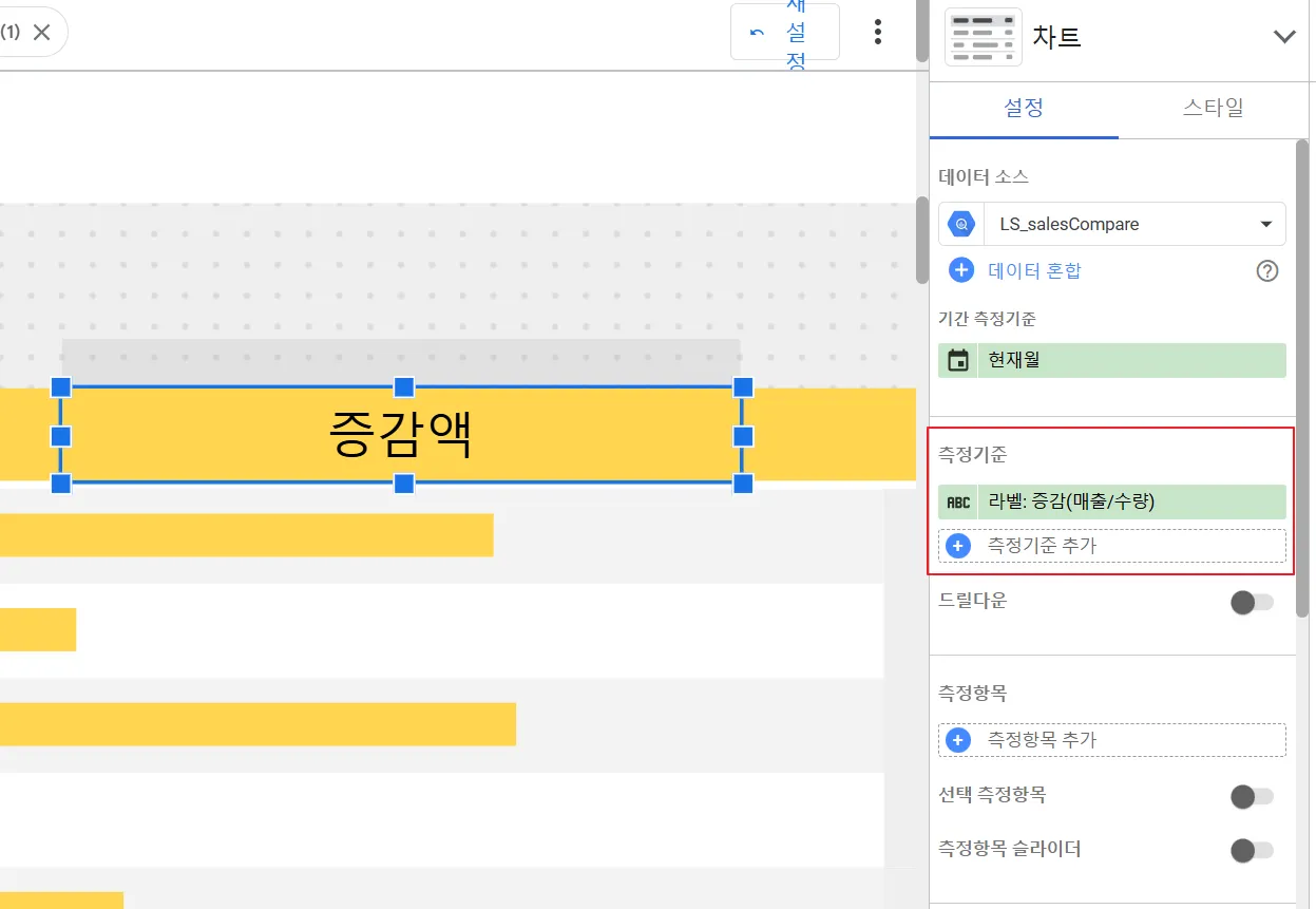 다음은 선택된 연도가 아니라 전년도 라벨을 넣어야합니다. ‘비교월’을 측정기준에 넣고 연도만 보여주면 되겠죠?