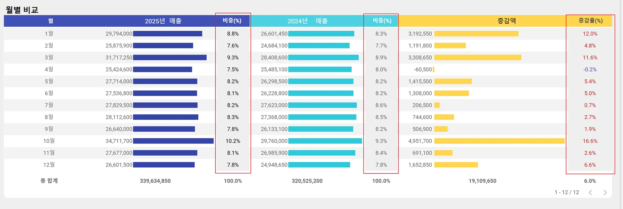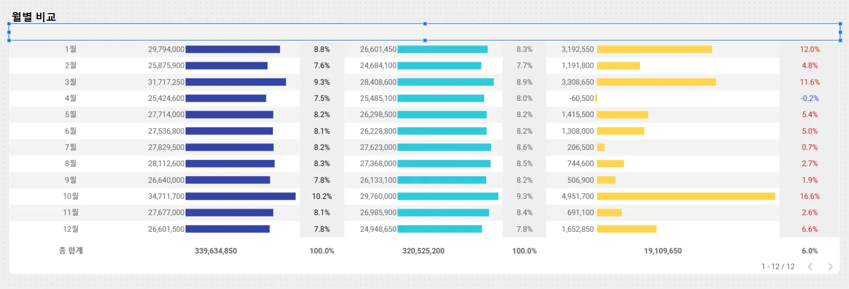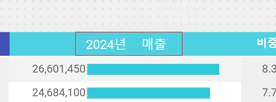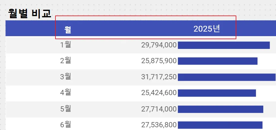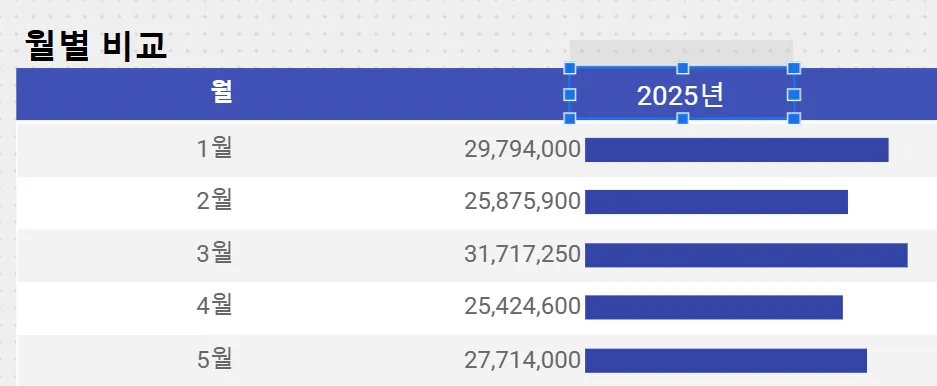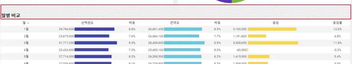 커스텀 헤더(표 차트): 현재 선택된 연도와 측정항목을 보여주고, 측정항목에 따라 증감된 값을 ‘증감량’ 또는 ‘증감액’으로 표시합니다.