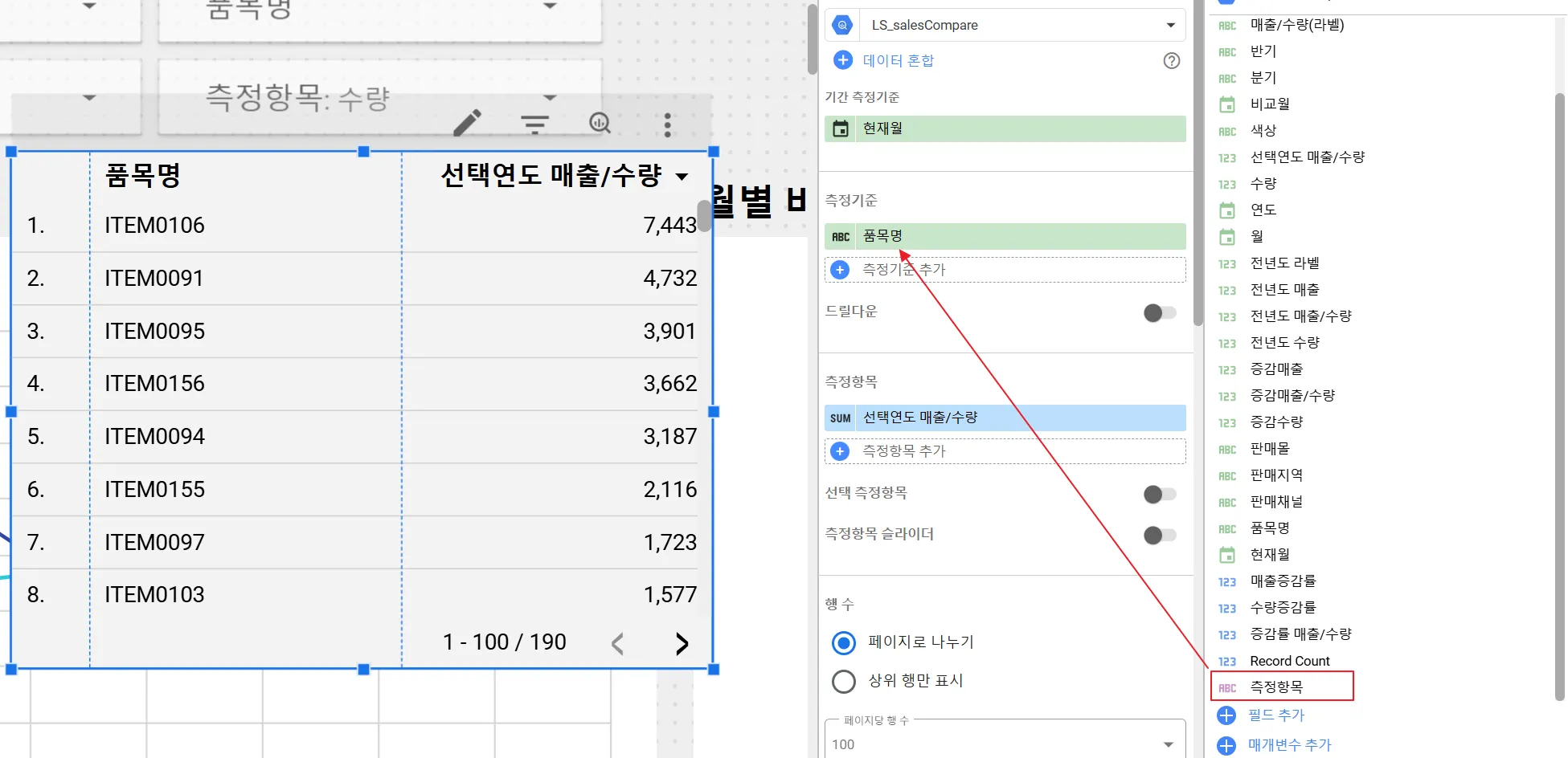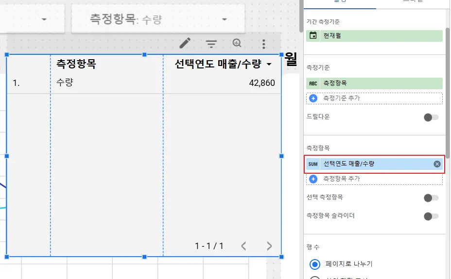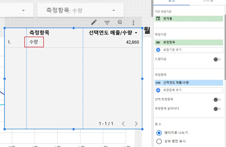 이번엔 측정항목을 ‘수량’으로 지정해보겠습니다.