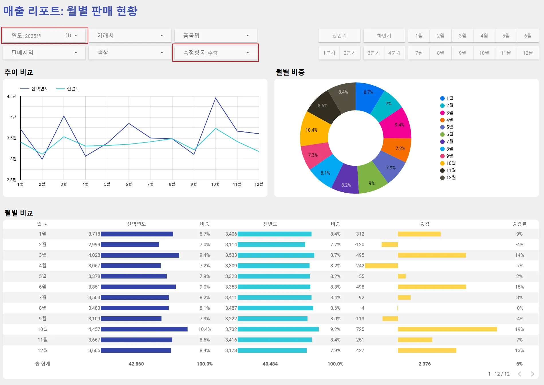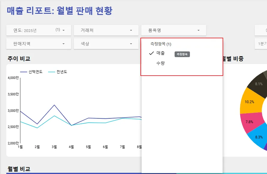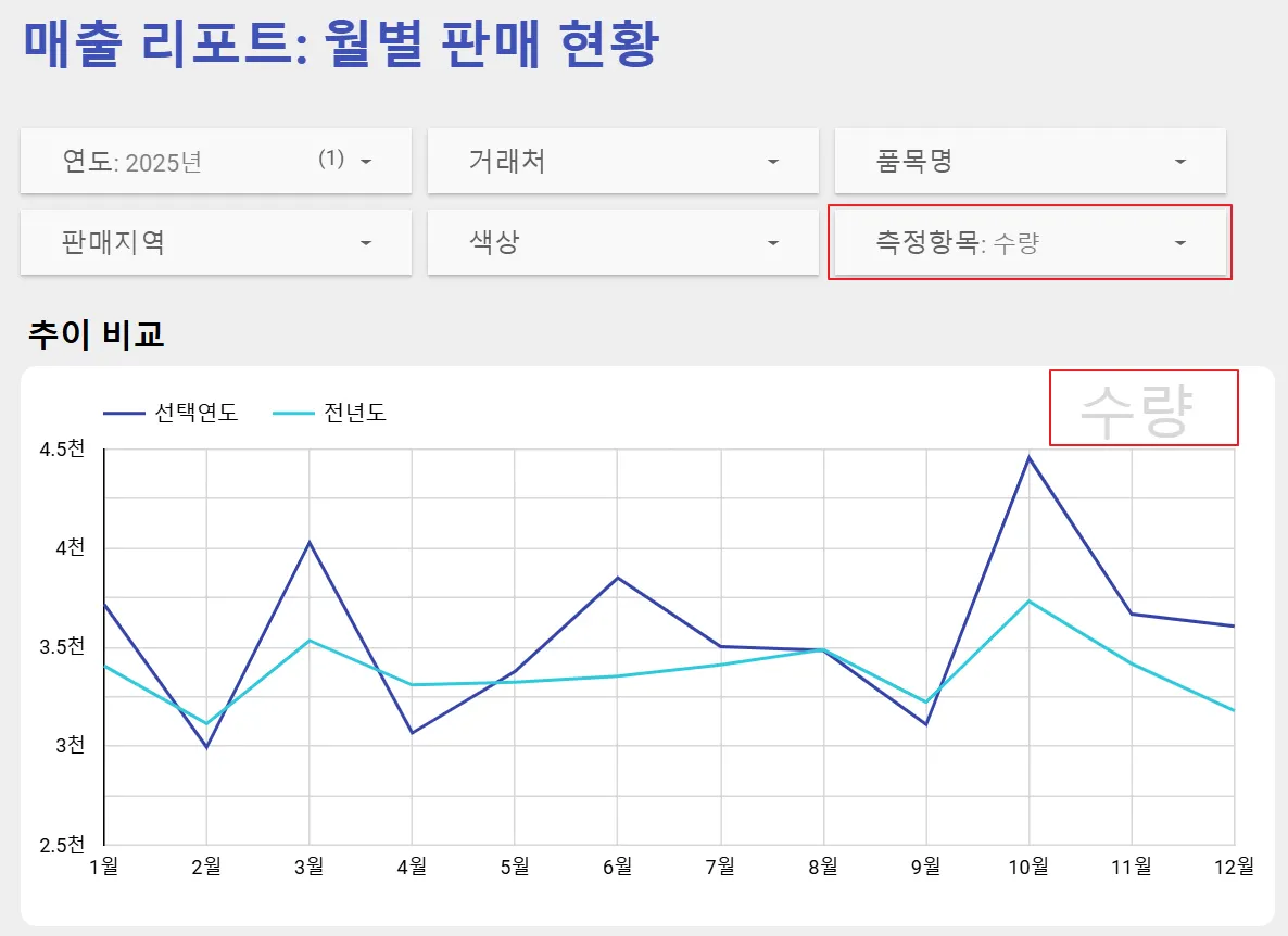 좌측 상단에 있는 연도 필터에서 ‘2025년’을, 측정항목 필터에서 ‘수량’을 선택하였습니다. 이제 대시보드는 2025년의 수량 데이터를 보여주고 있습니다.