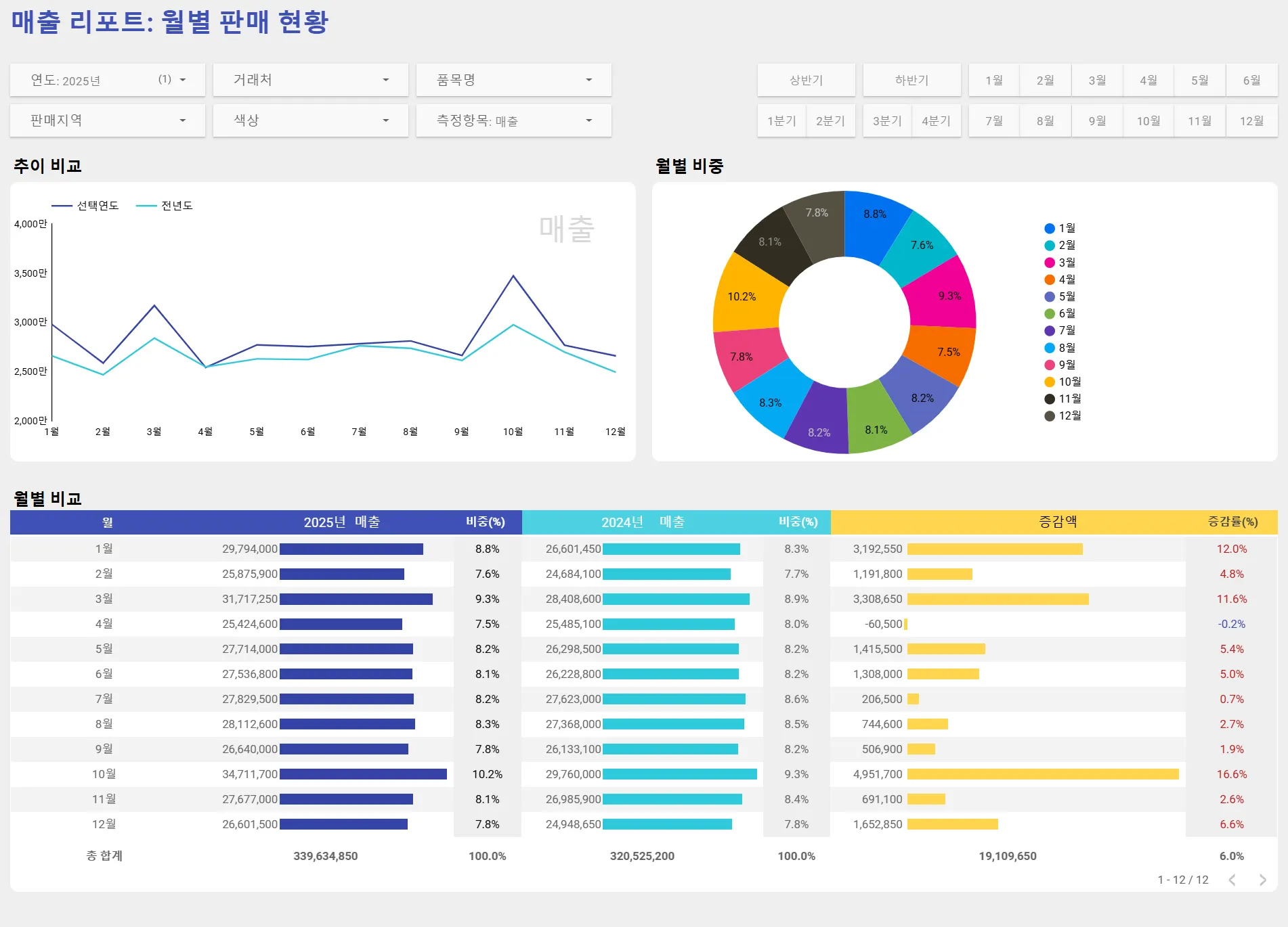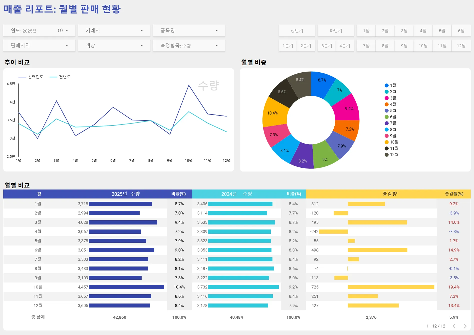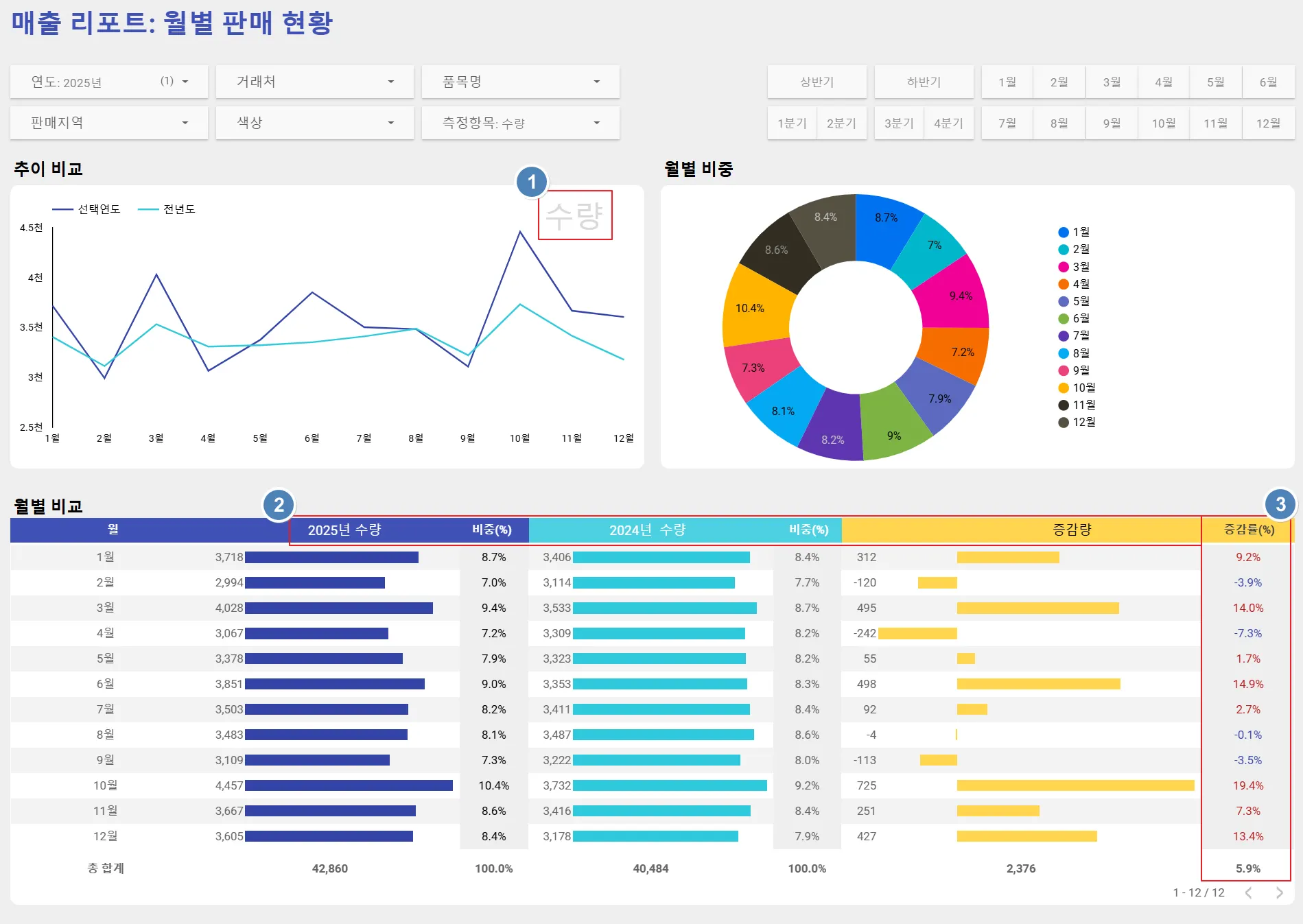 좌측 상단에 있는 연도 필터에서 ‘2025년’을, 측정항목 필터에서 ‘수량’을 선택하였습니다. 이제 대시보드는 2025년의 수량 데이터를 보여주고 있습니다.