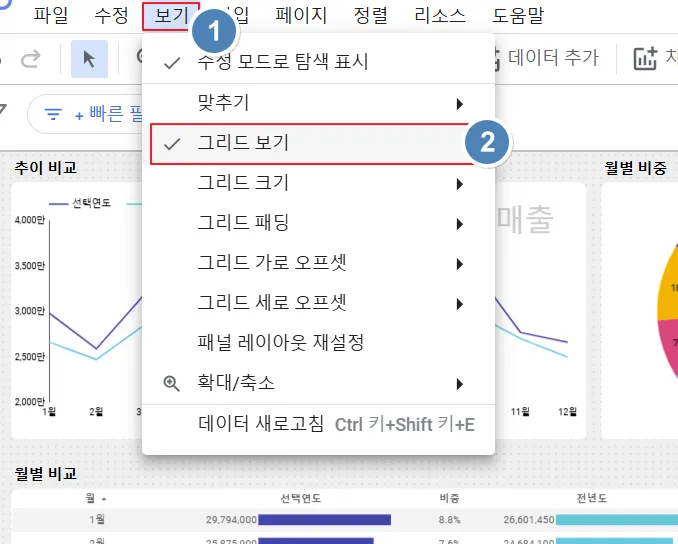 루커 스튜디오의 차트의 크기를 조정하거나 이동할 때에 아주 작은 단위로 미세하게 조절이 가능하지만 루커 스튜디오를 재실행하면 위치나 사이즈가 틀어질 때가 있습니다. 하지만 배경에 설정된 그리드(도트) 단위로 사이즈를 조정하거나 배치하면 문제가 발생하지 않습니다. 배경에 그리드(도트)를 표시하려면 ‘보기’ → ‘그리드 보기’를 클릭해주세요.