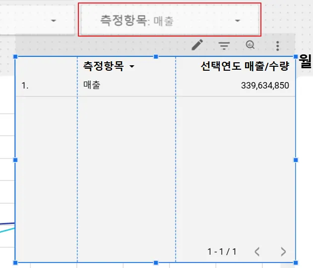 측정항목 필터를 ‘매출’로 설정하면 표의 측정항목 역시 ‘매출’로 바뀝니다.