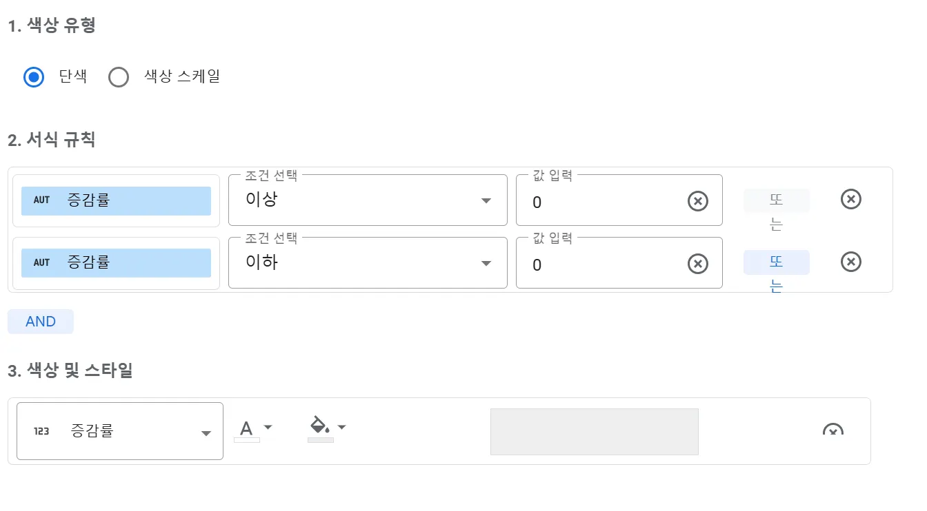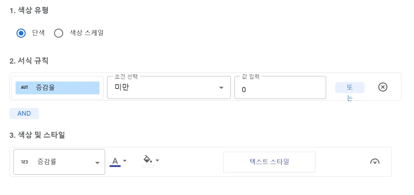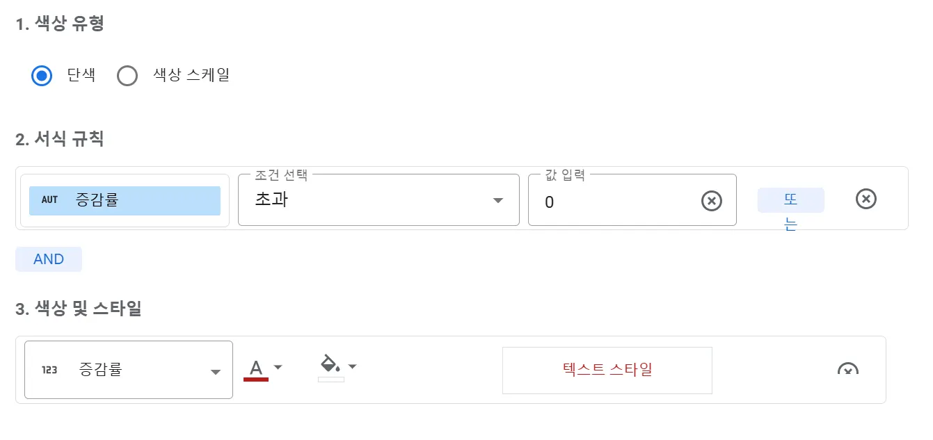 (1) 색상 유형: 색상 유형 옵션은 단색과 색상 스케일로 나뉩니다. ‘단색’은 특정 조건에 따라 셀이나 텍스트의 색상을 한 가지 색상으로 지정합니다. 간단한 조건을 기반으로 데이터를 시각적으로 분류하기에 적합합니다. ‘색상 스케일’은 숫자 값의 범위에 따라 색상이 점진적으로 변화하는 스케일을 적용합니다. 값의 크기를 상대적으로 비교하거나, 데이터를 연속적인 스펙트럼으로 시각화하고 싶다면 ‘색상 스케일’ 옵션이 적합합니다. 이번 예시에서는 ‘단색’ 옵션을 적용하였습니다.
