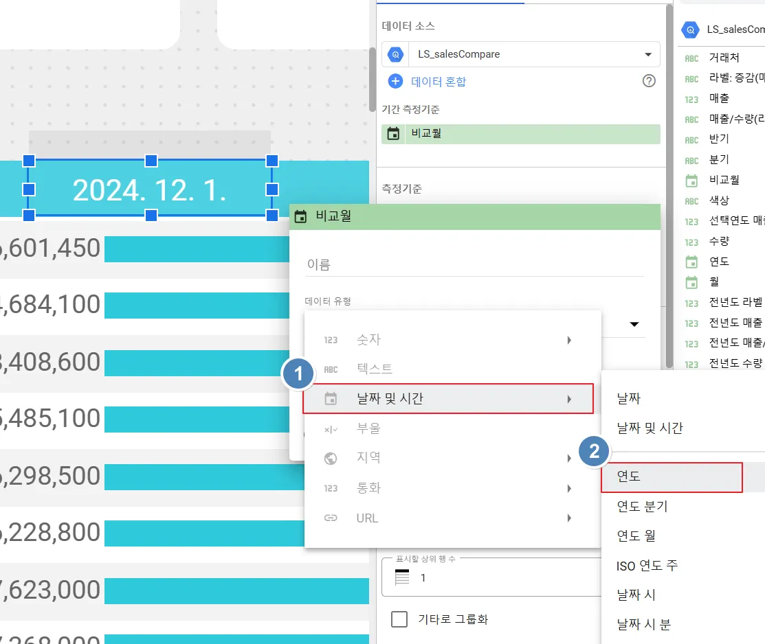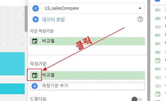 연도만 보여주는 방법은 측정기준에 있는 ‘비교월’의 좌측 작은 아이콘을 클릭합니다. 이 기능은 차트에 노출되는 필드명을 변경하거나 데이터 유형 또는 표시 형식을 변경할 때 사용합니다.