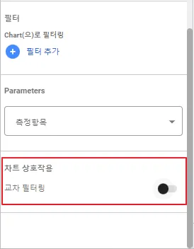 차트 설정 메뉴의 하단에는 ‘교차필터링’을 OFF 하면 클릭이 되지 않으므로 필수로 설정하는 것이 좋습니다. 하지만 이렇게 설정하더라도 해당 요소 위에 마우스를 올리면 클릭은 되지 않지만 커서가 변경됩니다. 커서까지 변경되지 않도록 하기 위해서는 다음 순서를 따를 수 있습니다.