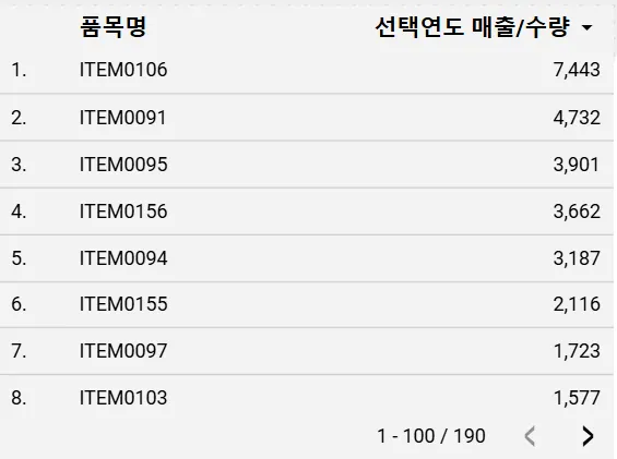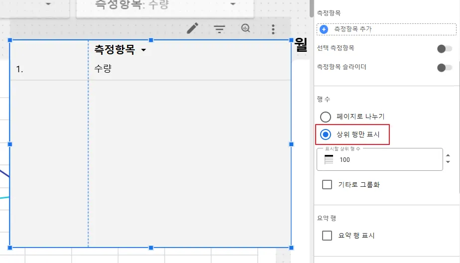 이 기능은 표 차트에서 한번에 표시할 최대 행 개수를 정하는 역할을 합니다. ‘페이지로 나누기’를 선택하면 설정 값을 초과하는 데이터는 다음 페이지에 표시합니다. 따라서 ‘페이지로 나누기’로 설정하면 하단에 페이지 번호가 나오지요. 반면에 아래 이미지처럼 ‘상위 행만 표시’ 로 설정하면 하위의 값들은 표시가 되지 않고 페이지 번호도 나오지 않습니다.