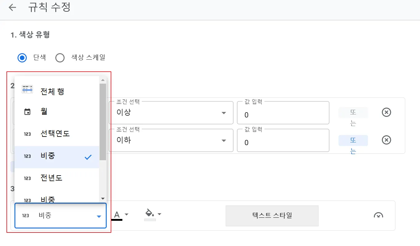 (3) 색상 및 스타일: 서식 규칙에 부합할 때 어느 범위까지 스타일을 지정하고, 어떤 스타일을 적용할 것인지를 지정합니다. 텍스트 색상과 배경 색상을 지정할 수 있습니다. 예시에서는 비중 열만 회색으로 지정하도록 설정하였습니다.