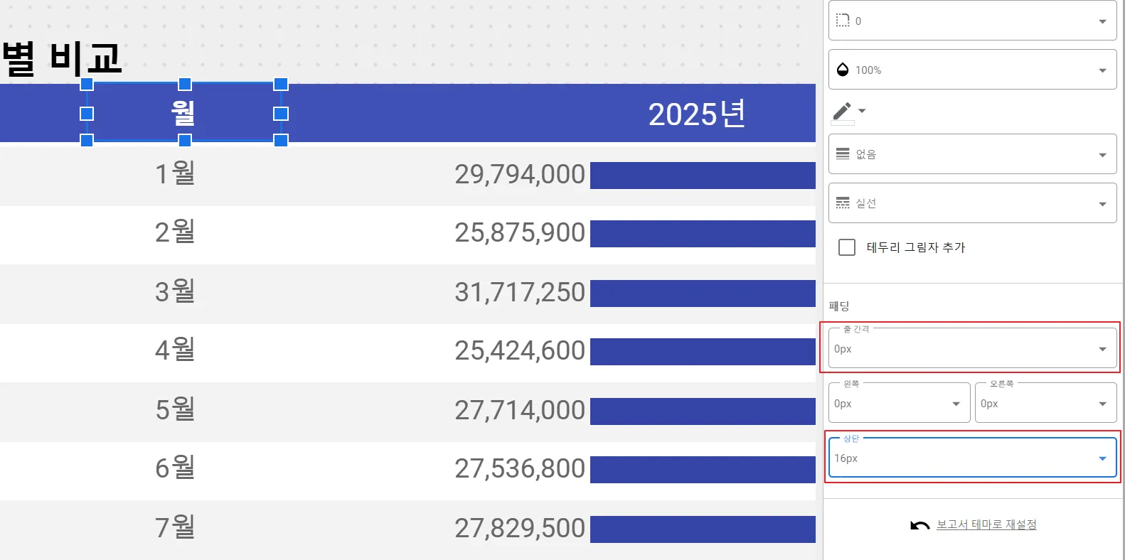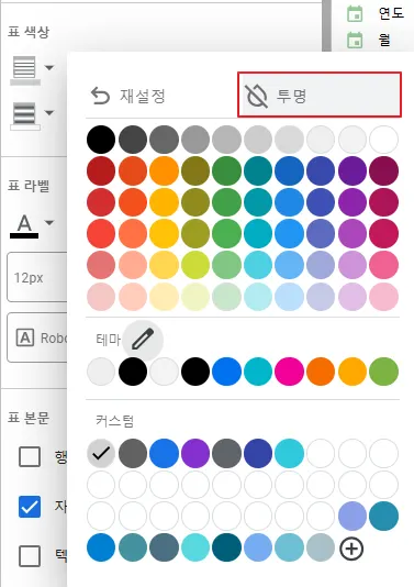 이제 연도만 표에 나오고 있죠. 그리드 색상과 배경 색상을 투명하게 설정 후 표의 사이즈를 헤더와 동일하게 축소하였습니다.