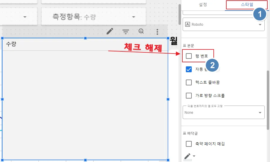 다음은 스타일 옵션을 설정해야지요. ‘표 헤더’의 ‘헤더 보기’와 ‘표 라벨’의 ‘행 번호’를 체크 해제 합니다.