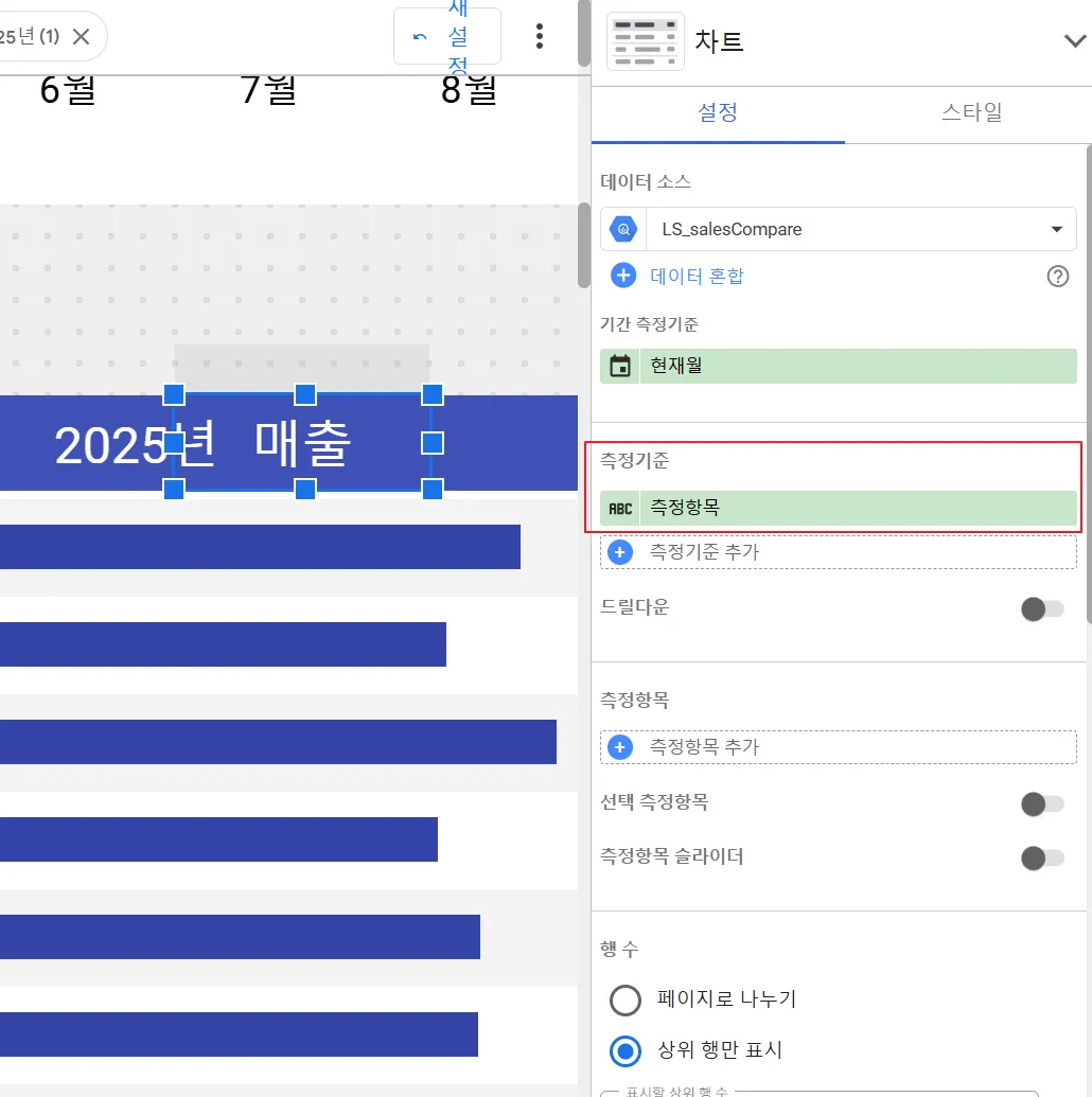 시계열 차트에 선택한 매개변수가 ‘매출’인지 ‘수량’인지 보여주기 위해 차트의 측정 기준을 ‘측정항목’ (매개변수) 필드로 바꿔보겠습니다.