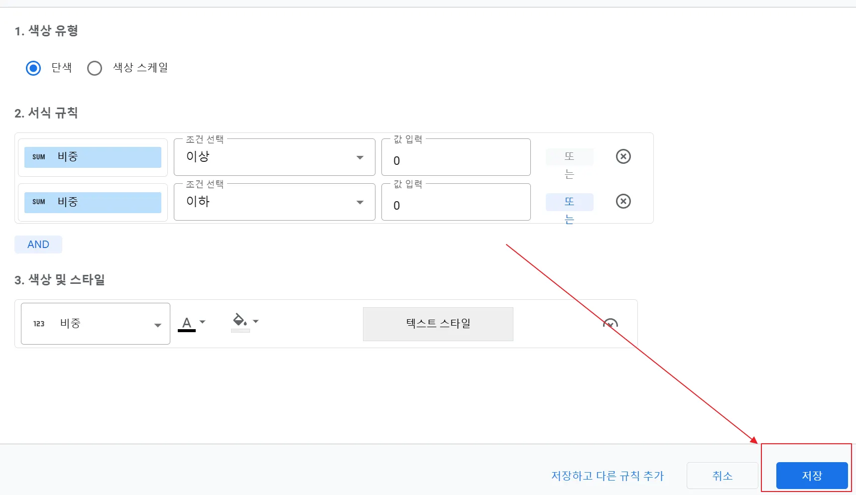 이제 예시에 실제로 적용된 각각의 조건들을 살펴볼까요? 먼저 ‘비중’ 열의 배경을 회색으로 처리하는 조건부 서식 세팅입니다. 비중이 0이상이거나 0이하인 값(사실상 모든 비중 값)에 대하여 배경색을 회색으로 지정한 것입니다. 조건과 서식을 설정 후 우측 하단의 ‘저장’버튼을 클릭하면 조건부 서식이 적용됩니다 .
