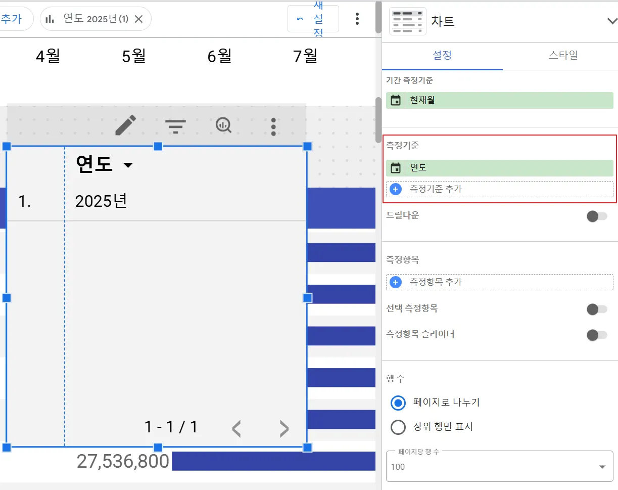 표 차트에 현재 선택된 연도만 나옵니다. 이제 스타일을 포함한 여러 옵션의 설정을 통해 측정기준인 연도만 표에 나오도록 설정하겠습니다. ‘2. 시계열 차트 스타일’ 에서 살펴본 내용들이 기억나지요?