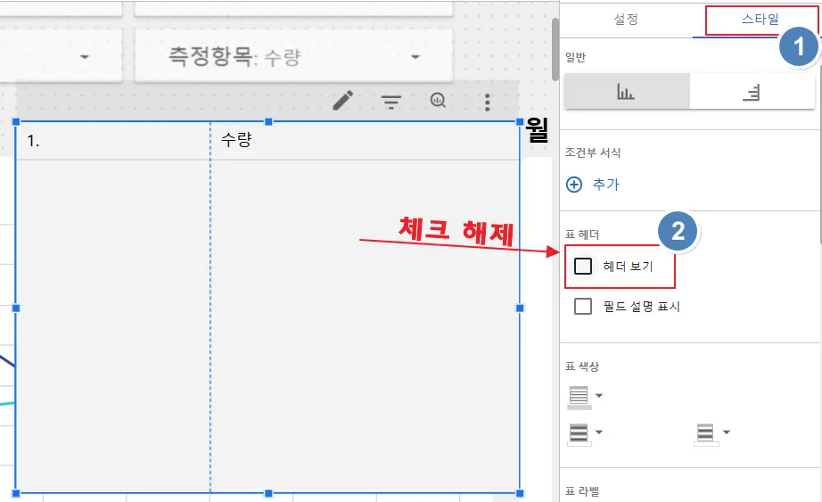 차트의 헤더는 스타일 탭의 ‘표 헤더’ 옵션의 ‘헤더 보기’를 해제하면 없어집니다.