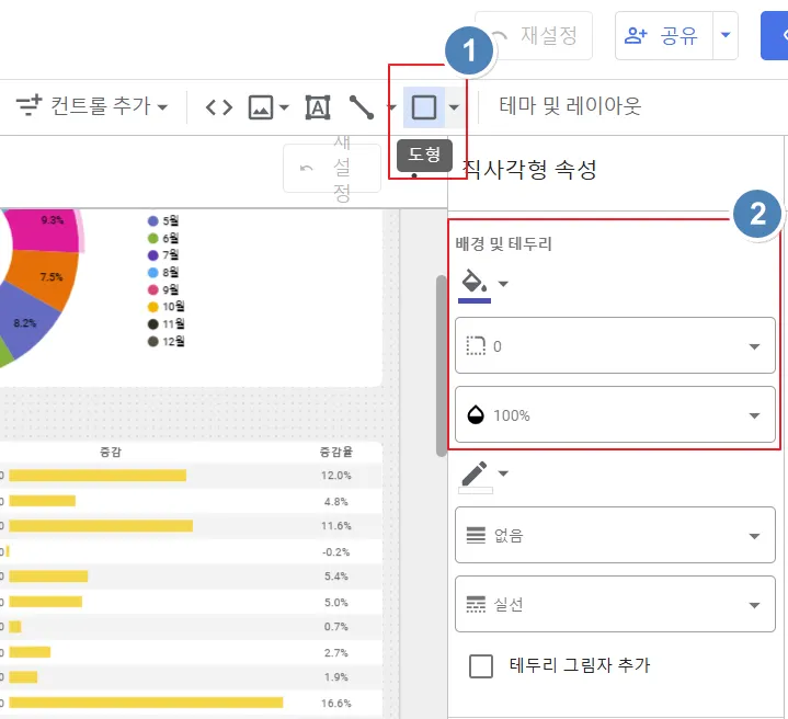 ‘도형’ → ‘배경 및 테두리’ 속성 설정