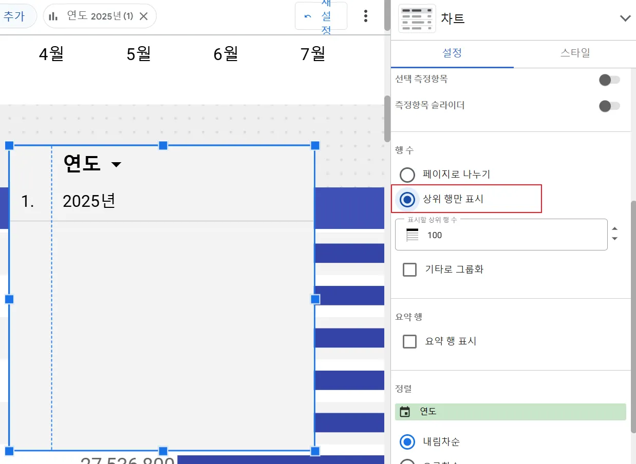 차트의 설정 창에서 아래로 스크롤하면 ‘행 수’ 라는 탭이 나옵니다. 여기서 ‘상위 행만 표시’로 설정하면 하단의 페이지 번호가 사라집니다.