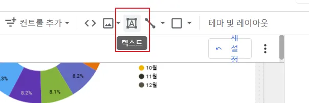 차트의 헤더에 고정된 값은 텍스트로, 선택한 연도와 항목에 따라 동적으로 보여주는 값들은 표 차트로 보여줍니다. 먼저 텍스트를 추가해보겠습니다. 상단의 ‘텍스트’를 클릭합니다.