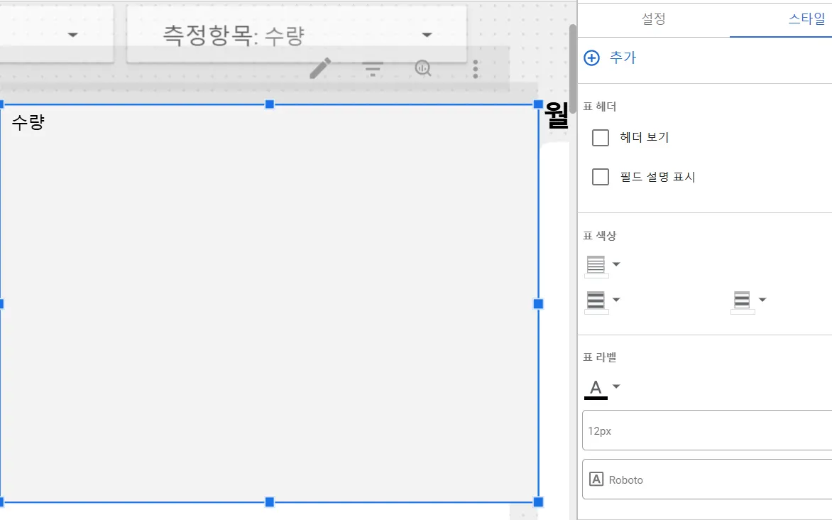 다음은 측정항목을 표시하는 표를 추가합니다. ‘측정항목’ 매개변수를 직접 측정기준에 삽입합니다. 스타일 세팅은 위와 동일하게 설정하였습니다.