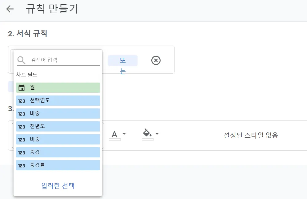 서식 규칙에서 나오는 필드의 목록은 차트에 삽입된 측정 기준, 항목 순서와 동일합니다. 따라서 ‘비중’필드가 2개 있지만 차트에 삽입한 순서를 참고하여 구분할 수 있습니다. 예를 들어, ‘선택연도’ 다음 ‘비중’은 선택연도에 대한 비중, ‘전년도’ 다음 ‘비중’은 전년도에 대한 ‘비중’으로 이해하면 쉽습니다.