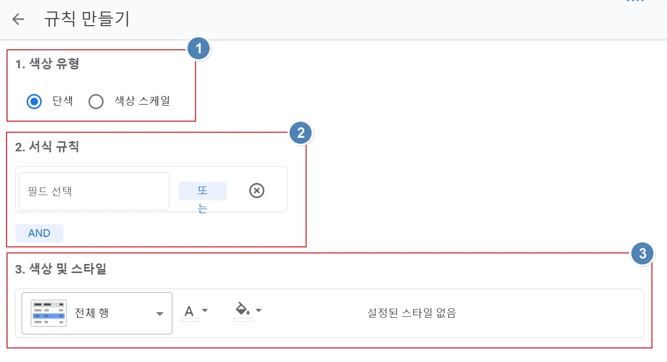 (2) 서식 규칙: 행 또는 열에 조건을 설정하는 기능입니다. 숫자, 텍스트, 날짜, 빈 셀 여부, 특정 조건식 등에 따라 서식을 적용하고자 하는 조건을 설정합니다.