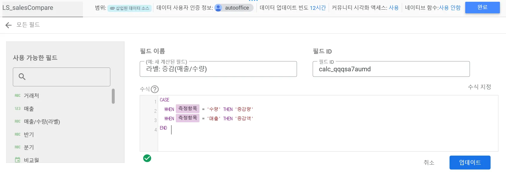 다음은 측정항목에 따라 ‘증감액’ 또는 ‘증감량’으로 표시하는 라벨을 추가해야 합니다. 이것은 계산된 필드 기능으로 새로운 필드를 생성해야 합니다. 수식은 다음과 같습니다.