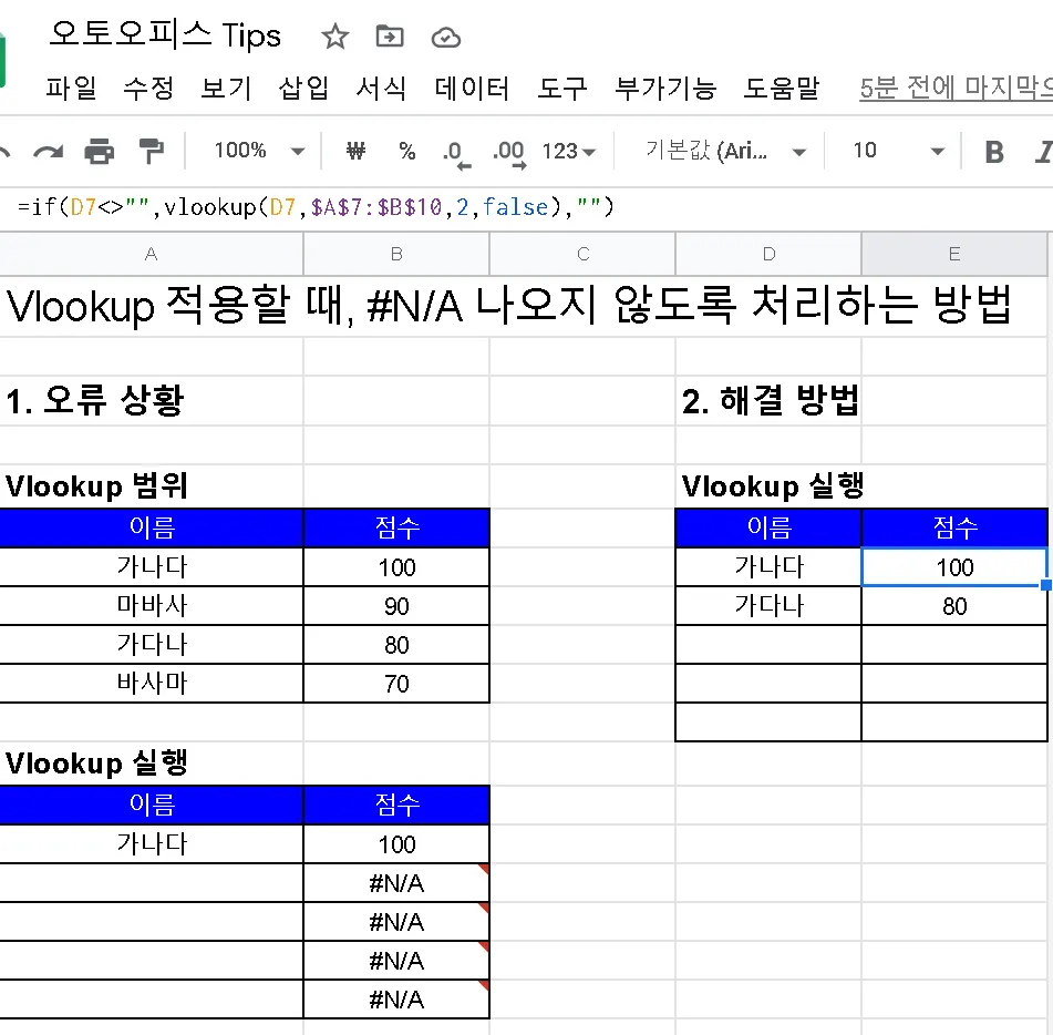 여기서는 빈칸인지 확인하는 것이 아니라 VLOOKUP을 먼저 실행합니다. 그래서 값이 있으면 그 값을 표시하고, 없으면 빈칸으로 표시합니다.