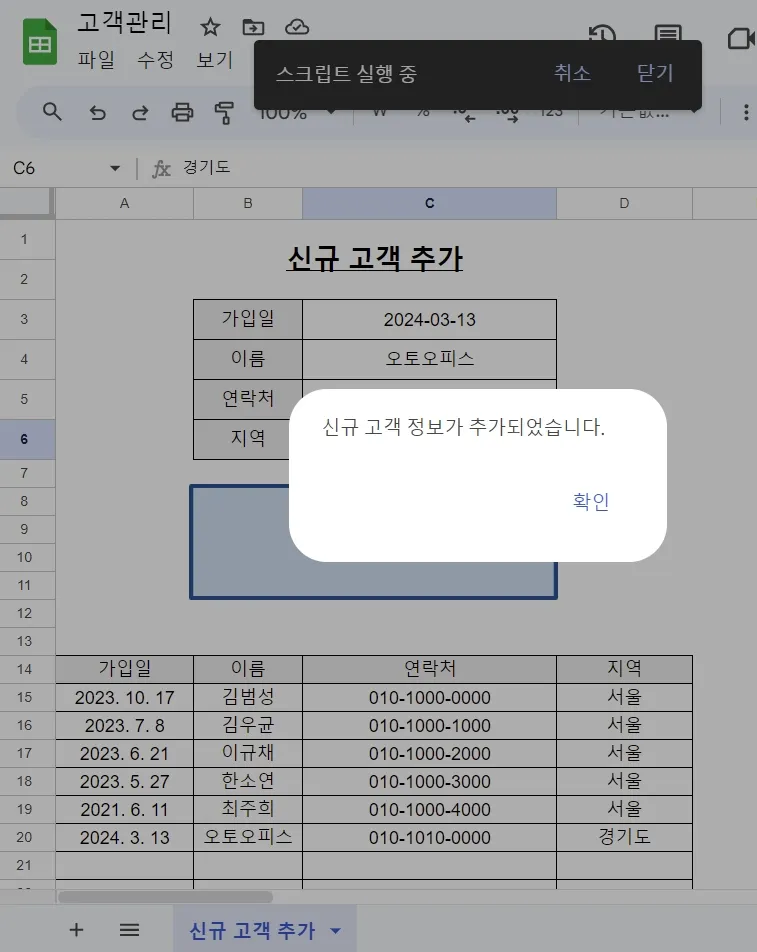 고객 정보가 추가되었다는 알림창이 정상적으로 출력되었습니다. 지정된 범위에 데이터가 잘 추가되었네요.