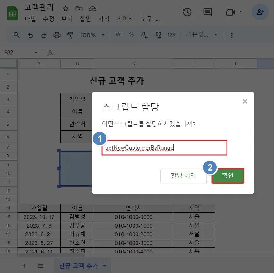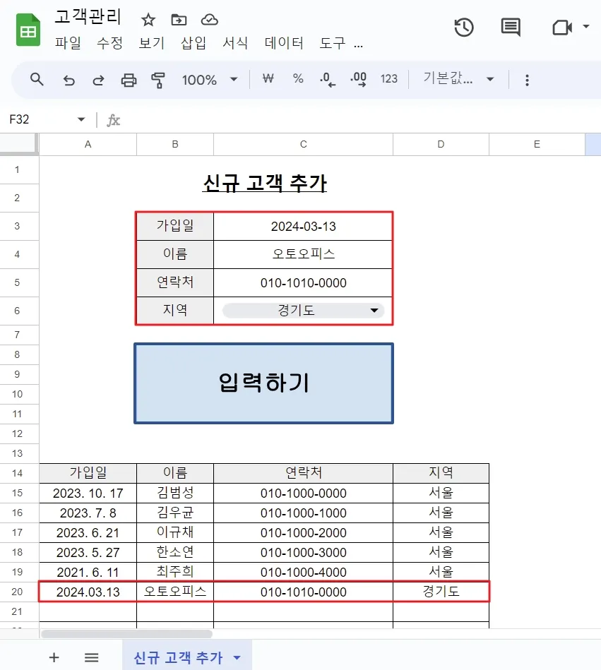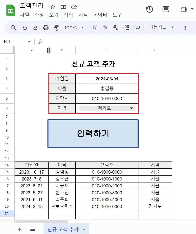 다음의 스프레드시트는 신규 고객의 정보를 입력하는 시트와 데이터가 저장되는 시트가 동일합니다. 신규 고객의 가입일과 이름, 연락처와 지역을 설정한 뒤에 ‘입력하기’ 버튼을 누르면, 하단에 데이터가 기입이 된다고 예를 들어보겠습니다.