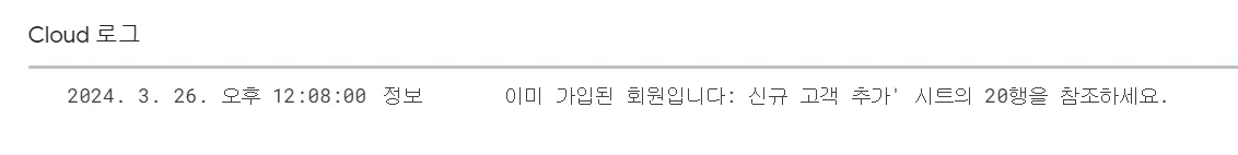 Logger.log(`이미 가입된 회원입니다: ${sheetName}' 시트의 ${row}행을 참조하세요.`)