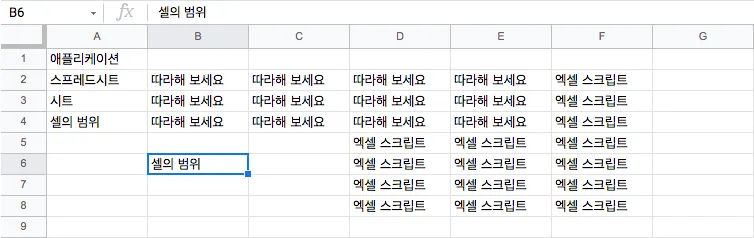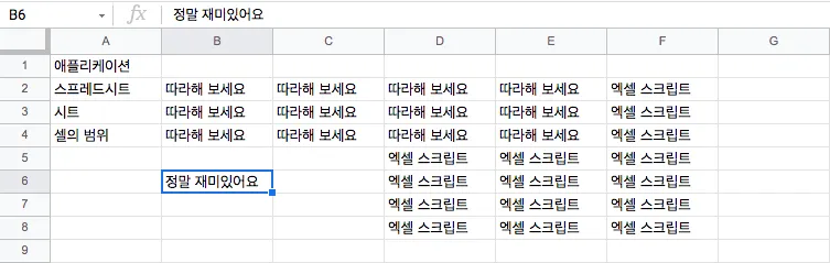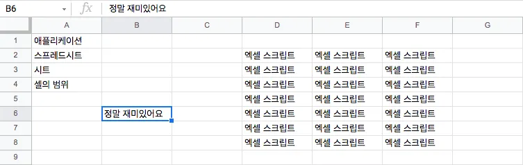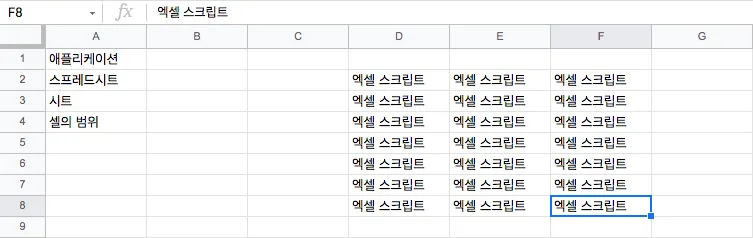 현재 활성화된 스프레드시트 파일의 활성화된 시트에 D2:F8 셀에 "스크립트" 를 입력해 보겠습니다.