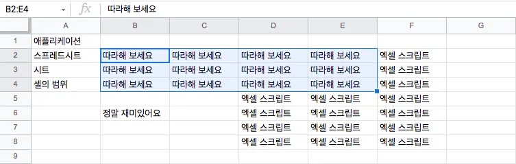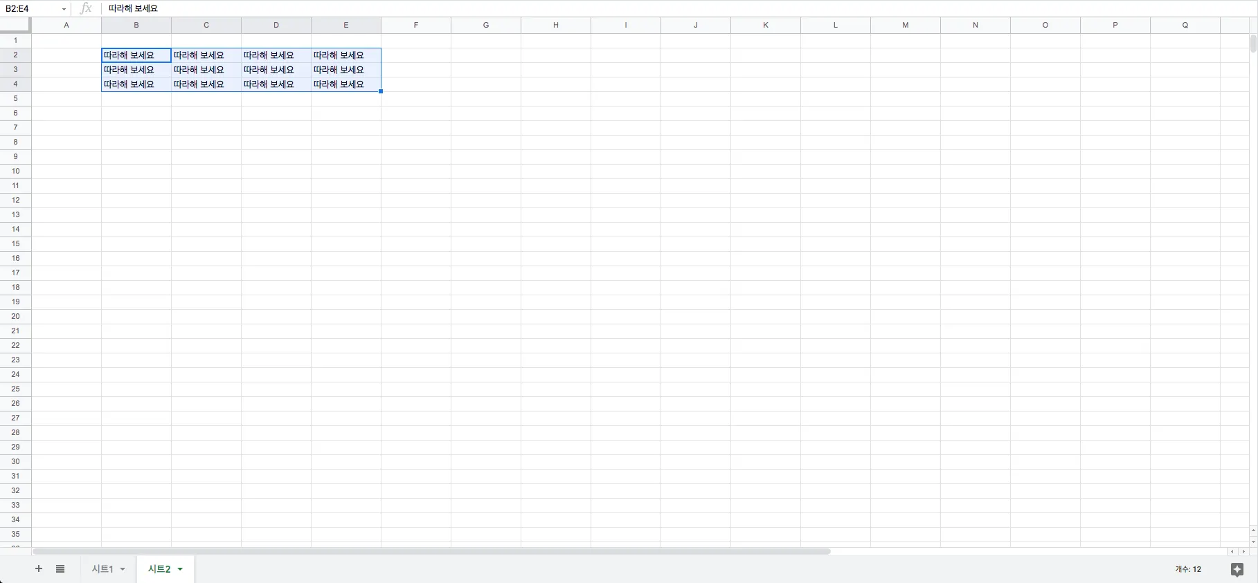 현재 활성화된 스프레드시트 파일의 활성화된 시트에 (2,2) 셀을 시작으로 행 3줄, 열 4줄에 해당하는 총 12셀에 "따라해 보세요" 를 입력해보겠습니다.