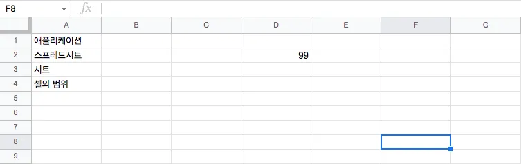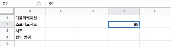 현재 활성화된 스프레드시트 파일의 활성화된 시트에 D2 셀에 99를 입력해 보겠습니다.