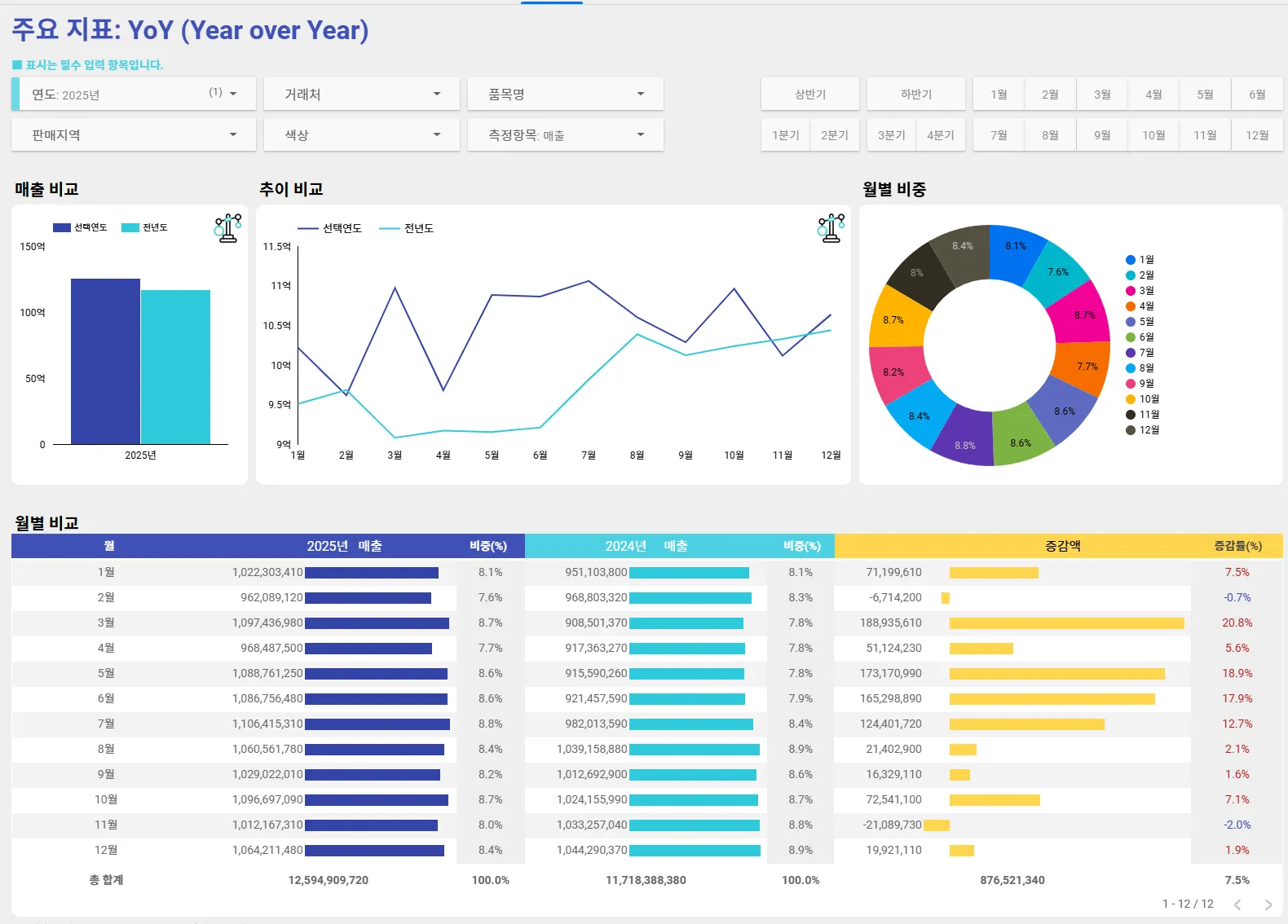 차트의 목적에 따라 드롭다운 컨트롤과 필터들을 적용했으며, 그룹핑을 통해서 드롭다운 컨트롤의 적용 범위를 정밀하게 조정했습니다. 또한 편의성을 위해 반기, 분기, 월별 버튼을 마련해서 원 클릭으로 필터링 되도록 마련했습니다.