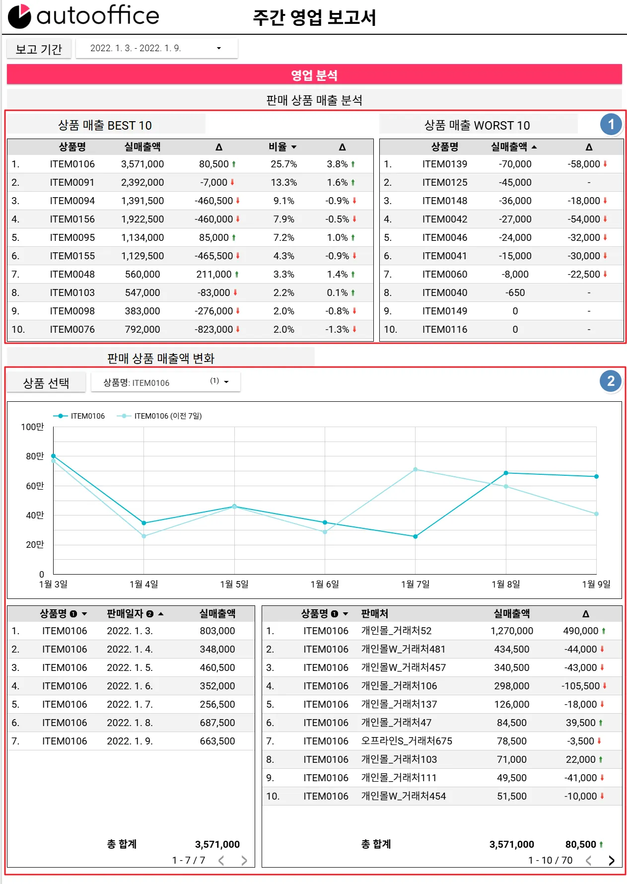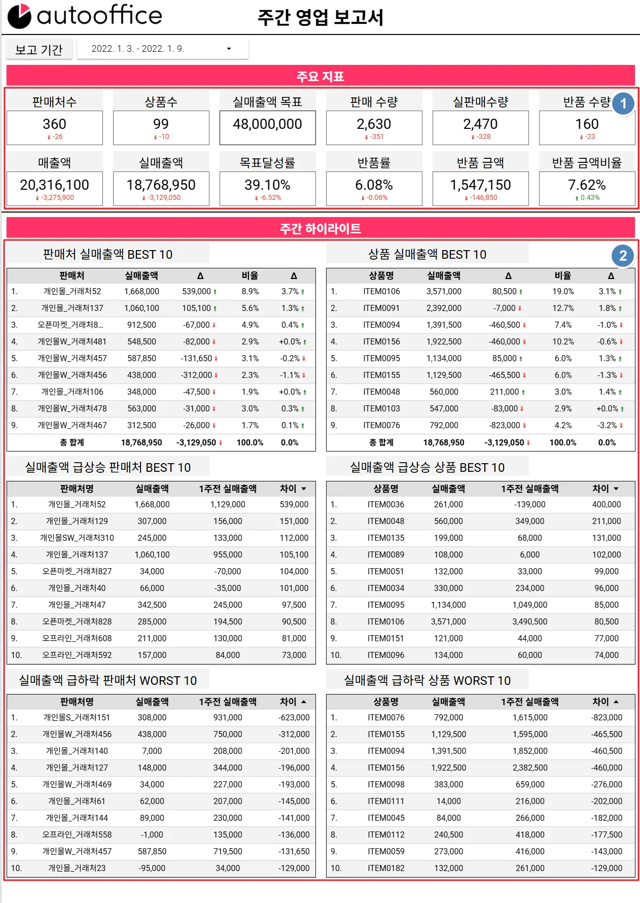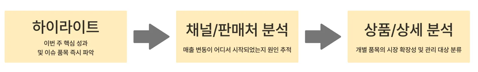 한 주간의 판매 성과를 가장 빠르게 파악하기 위한 요약 페이지로, 이번 주의 흐름이 전반적으로 어땠는지 파악할 수 있도록 했습니다.