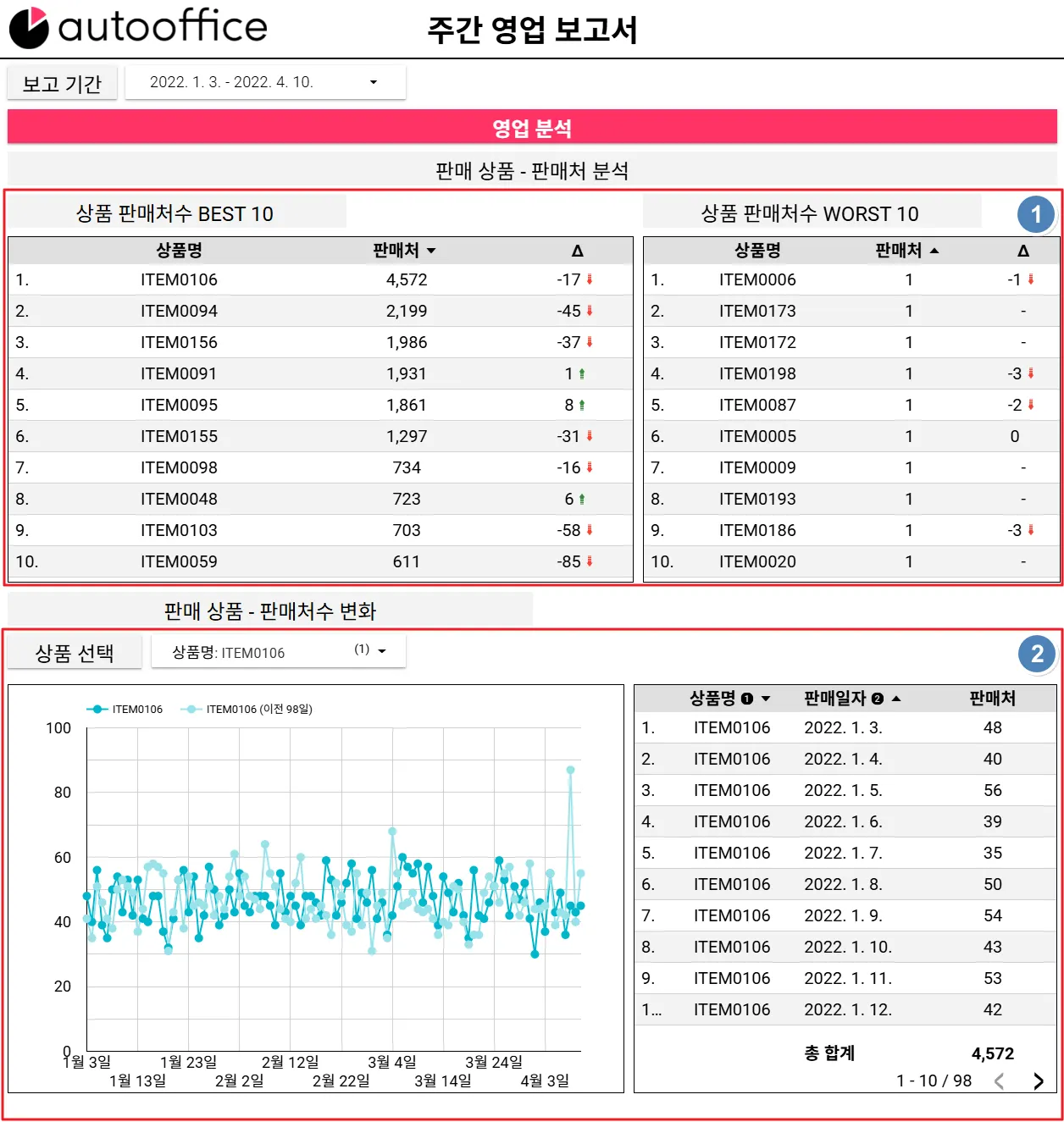 상품별로 발생한 매출 변화에 대해서 변화가 어디에서 발생하는지 살펴볼 수 있도록 했습니다. 이를 통해 꾸준히 판매되는 상품과 관리가 필요한 상품을 구분할 수 있습니다.