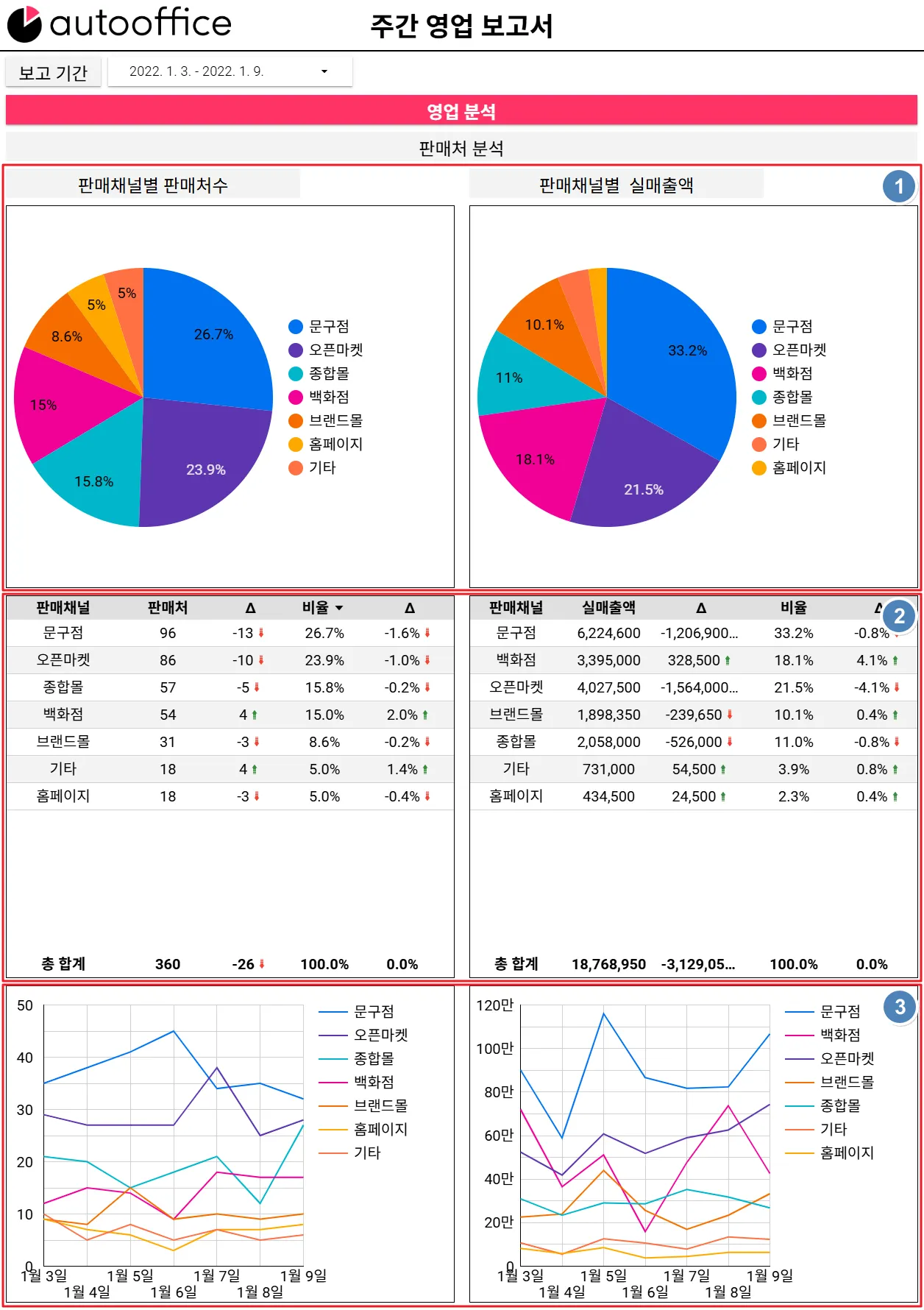 이 페이지는 판매처별로 발생한 매출 변화에 대해서 변화가 어디에서 발생하는지 살펴볼 수 있도록 제작하였습니다. 이를 통해 매출이 유지·성장하고 있는 판매처와 관리가 필요한 판매처를 구분할 수 있습니다.