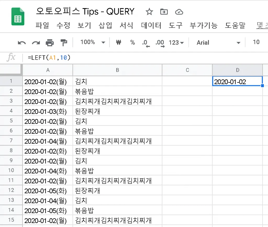 먼저 LEFT 함수로 셀에서 날짜 부분만 추출합니다.