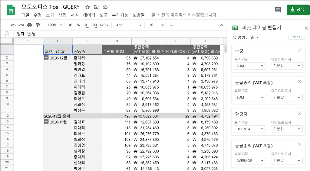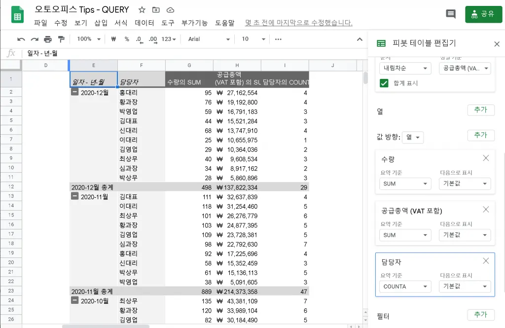 기록을 세는 것이기 때문에 담당자를 값에 추가하고 요약기준을 COUNTA 를 선택해도 되고, 수량을 추가하고 요약기준을 COUNTA 해도 동일한 결과를 얻습니다.