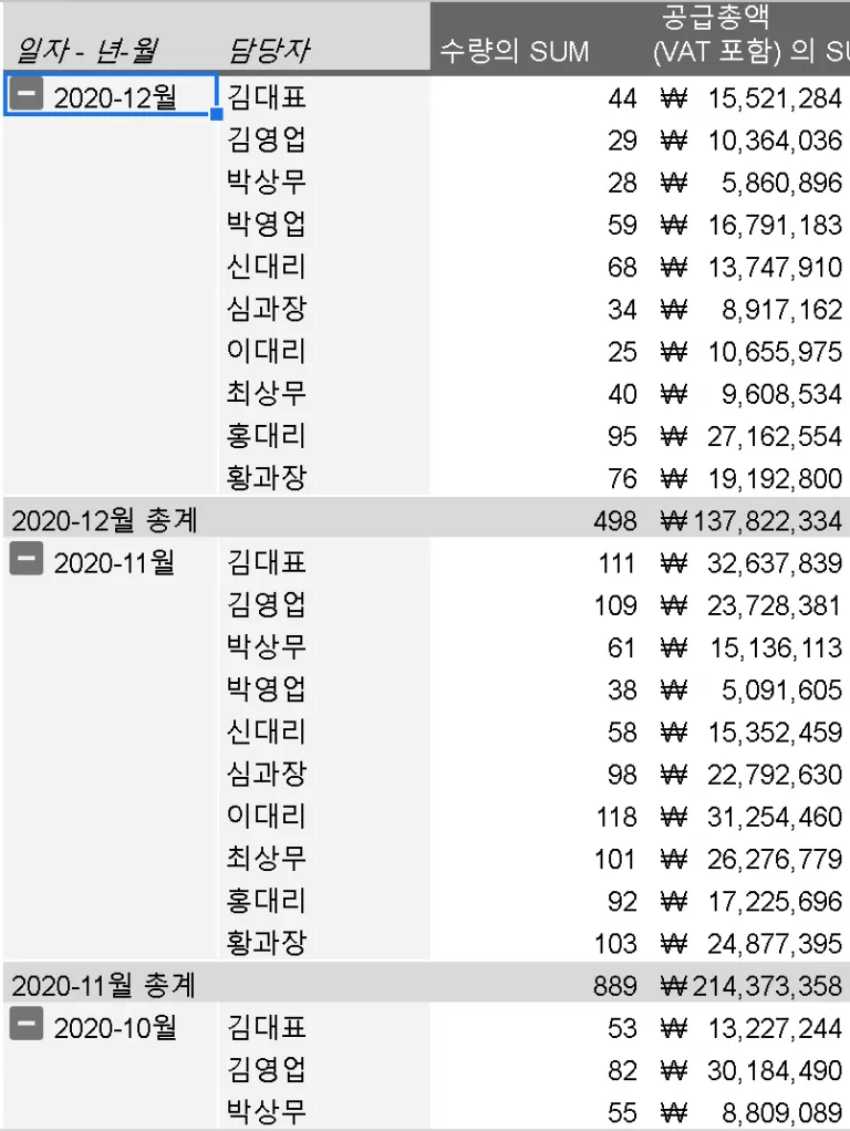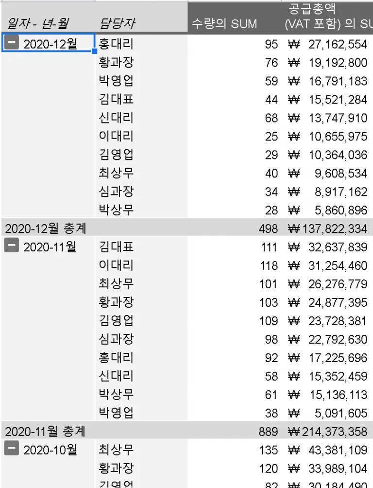 2. 월별 매입액 내에서는 담당자별 매입액을 볼 수 있으면서, 매입액 큰 담당자를 위에 표시할 것 → 2차 담당자 정렬