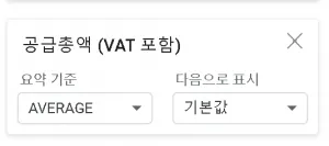 먼저 값에 공급총액을 추가합니다. 요약 기준의 기본값은 SUM 입니다. 이 값을 AVERAGE로 바꿉니다.