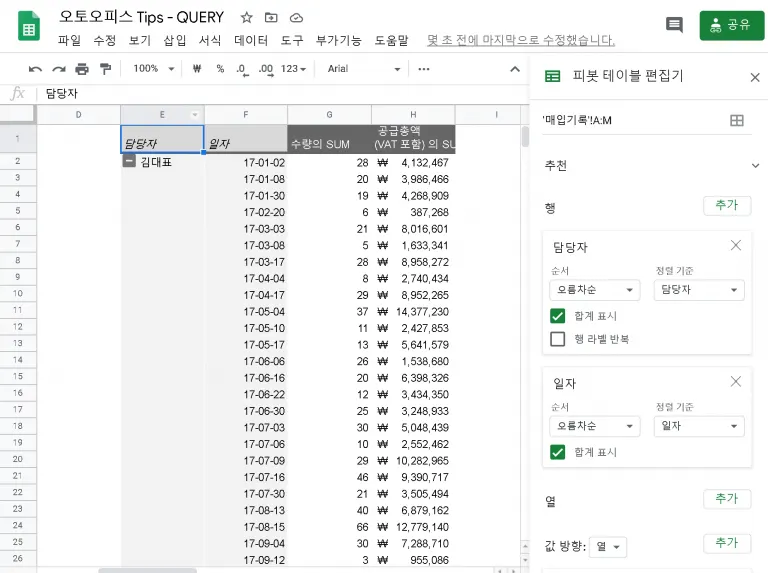 그래서 담당자 - 일자 순으로 피벗 테이블이 구성됩니다. 일자를 드래그해서 담당자 위로 올리겠습니다.